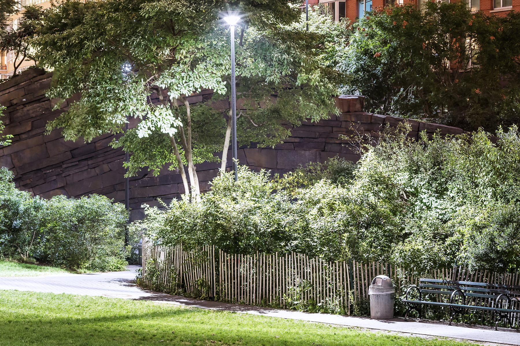 I wanted to capture the serene peace that falls over the neighborhood every evening, despite the hustle of the famous Financial District only a few blocks to the east, so I went to Teardrop Park on a warm early-Autumn day. I set up my gear on the northern end of the park, looking at the beautiful rows of trees, rock walls, stone paths, park benches, and homes that funnel to the southern point of the park.