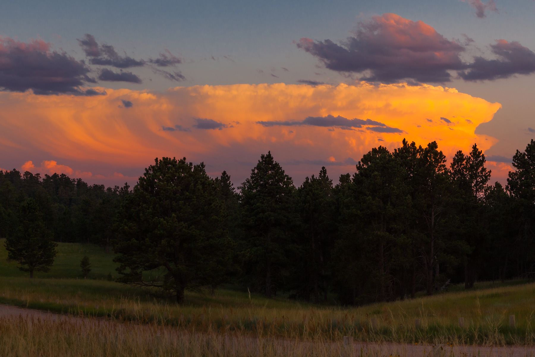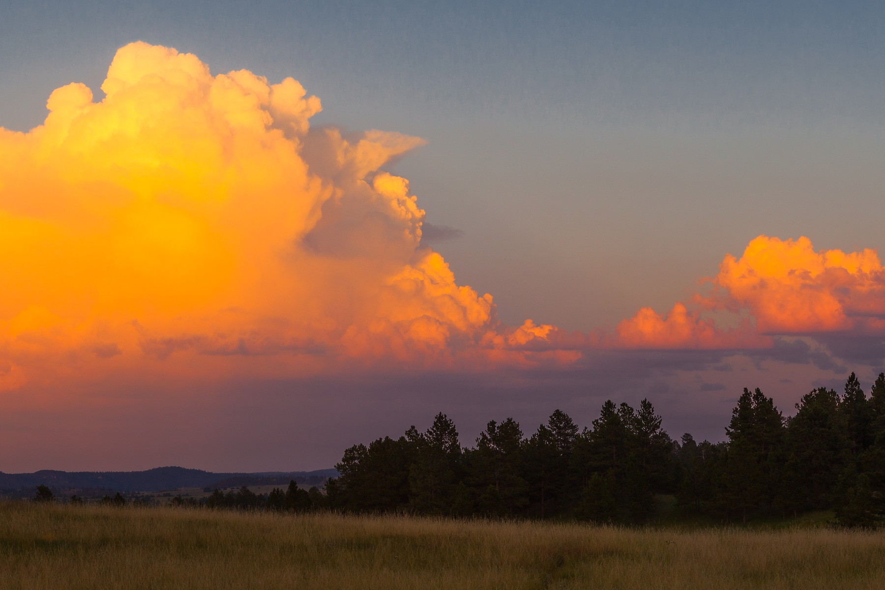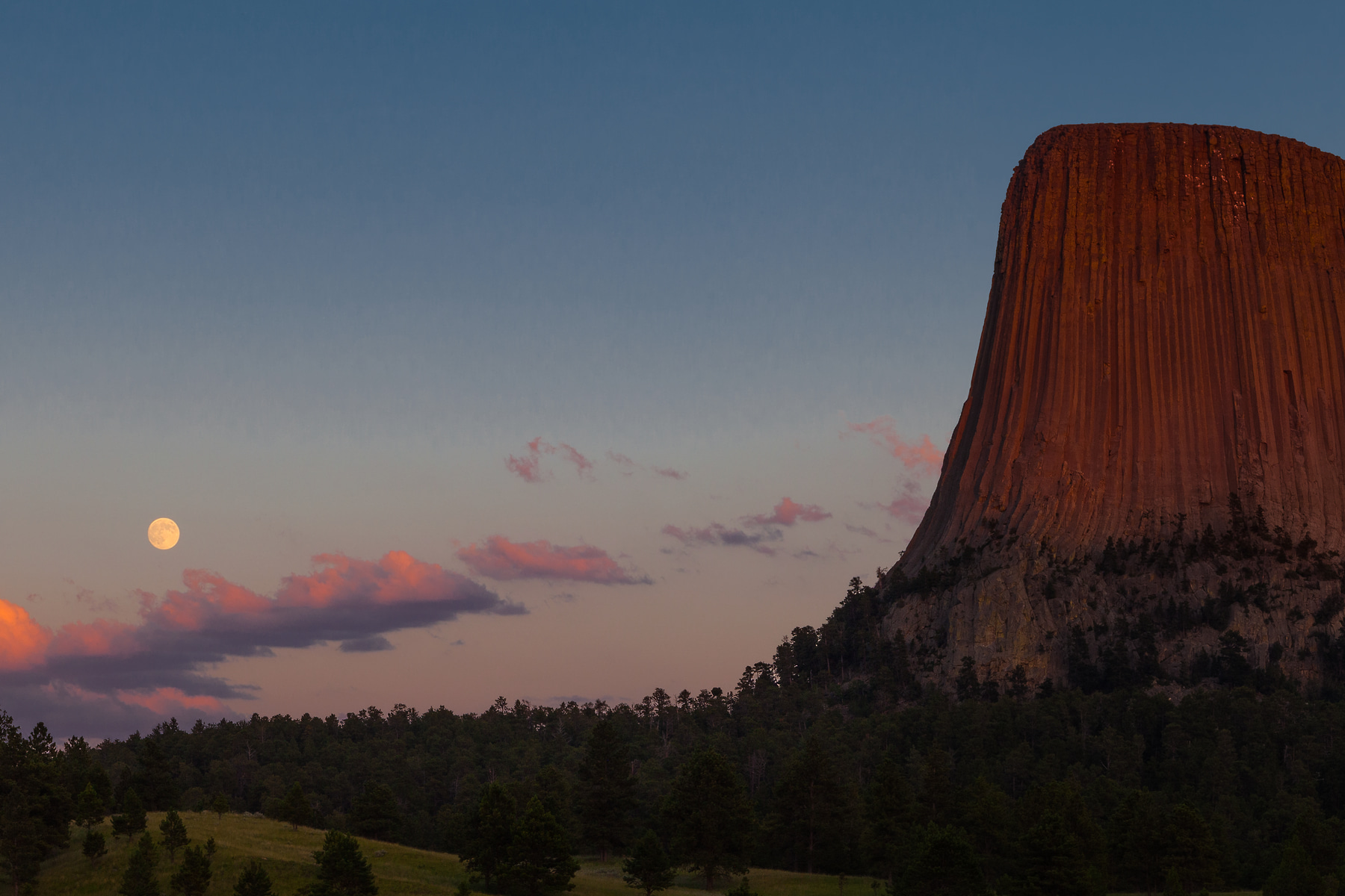 The last light of day warms Devils Tower with red alpenglow as the moon rises behind distant thunderstorms.