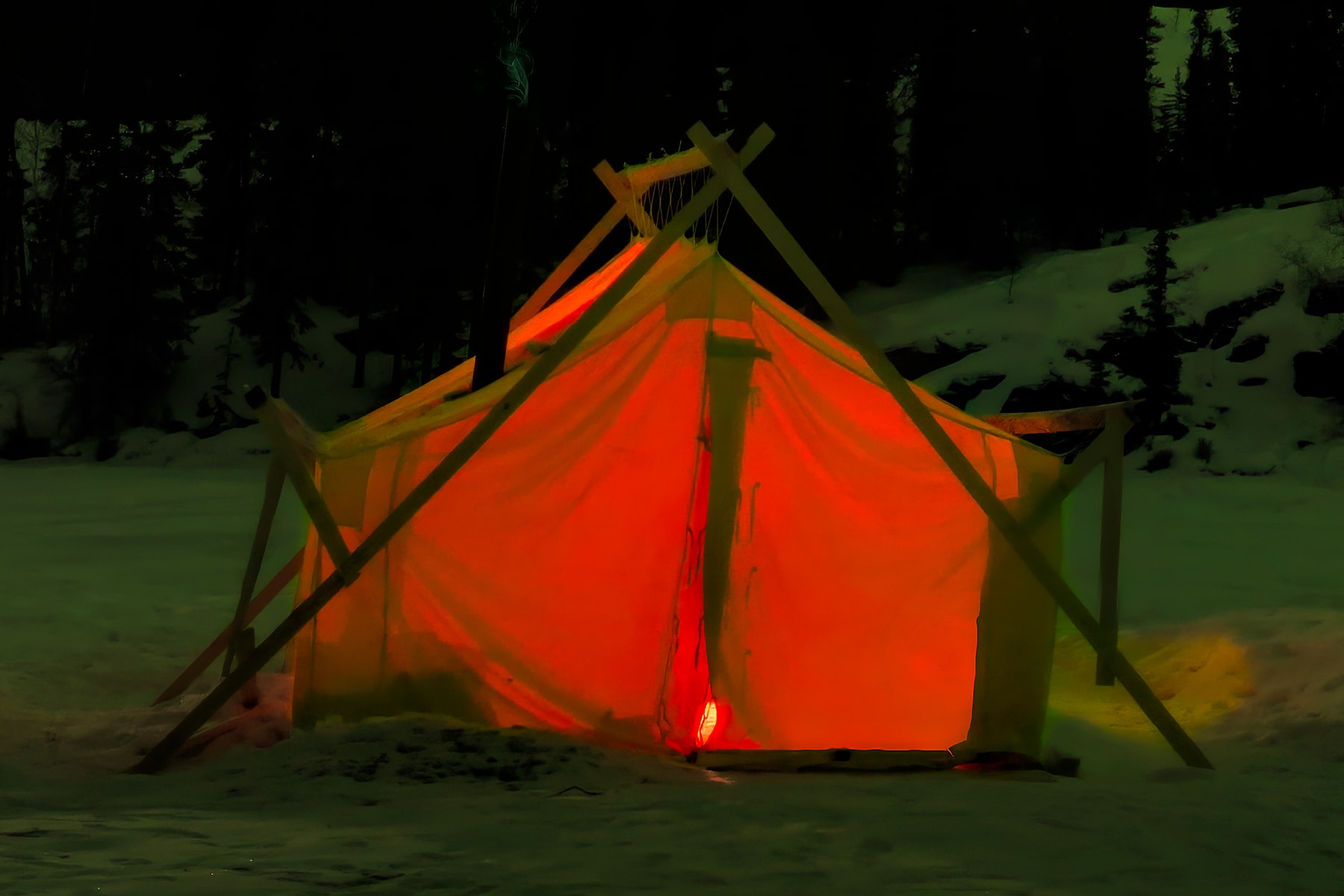 Common on these lakes are tents set up by snowmobilers as a base to warm up between runs. I had seen them glowing with gas-lantern lights on my first trip and had been searching for one to anchor an aurora photo ever since. On this night, everything came together. I was in position with a glowing tent in front of me, the special equipment I need to create a VAST photo set up, and a magnificent geomagnetic storm raging overhead.
