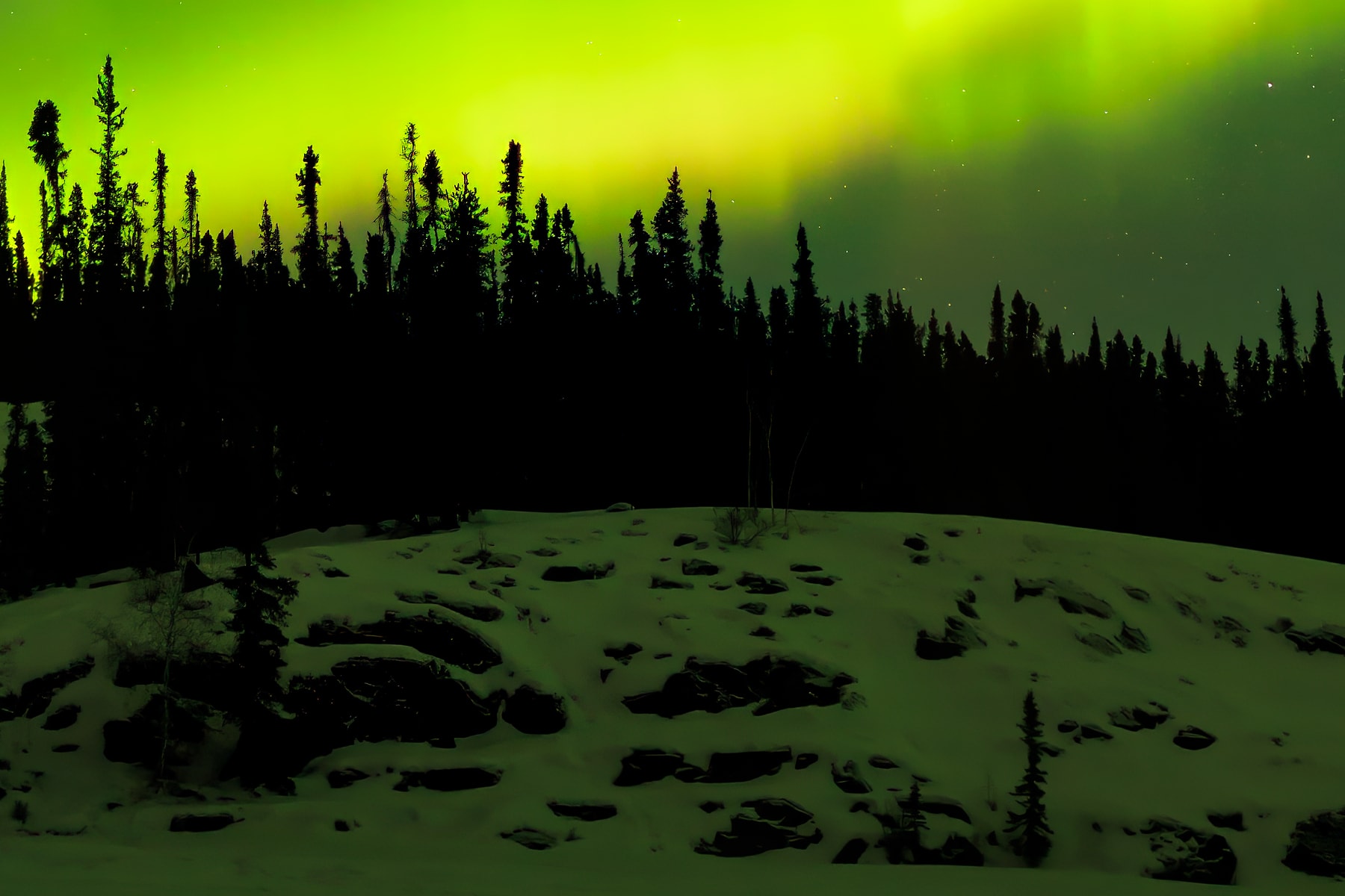 In the span of one year, I visited Yellowknife on four occasions with the sole purpose of photographing night skies with dancing aurora. One of those visits was in September but the other three were during times when there was still ice and snow all around. The interesting thing about the Yellowknife area is that there are many more roads open in the winter than in the summer and as a result, many areas are only accessible in winter months. This is because roads are created each winter on frozen lakes and run hundreds of miles in all directions.