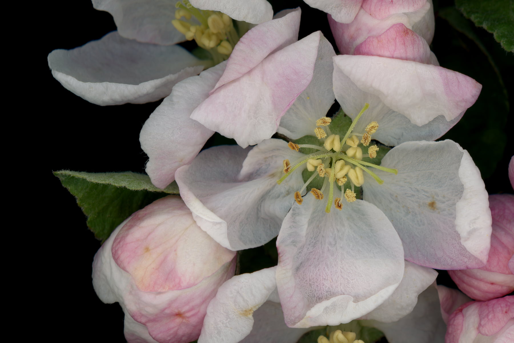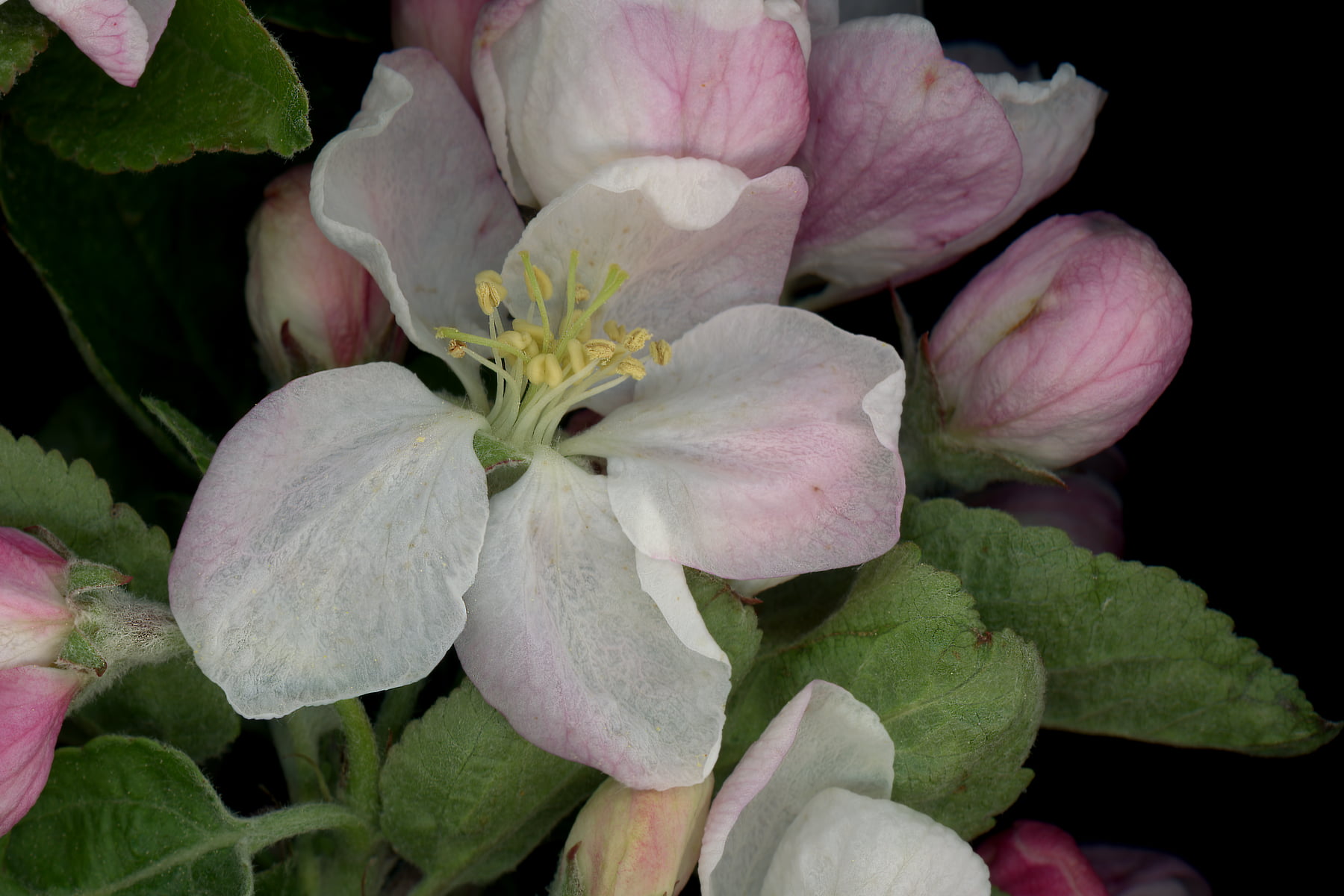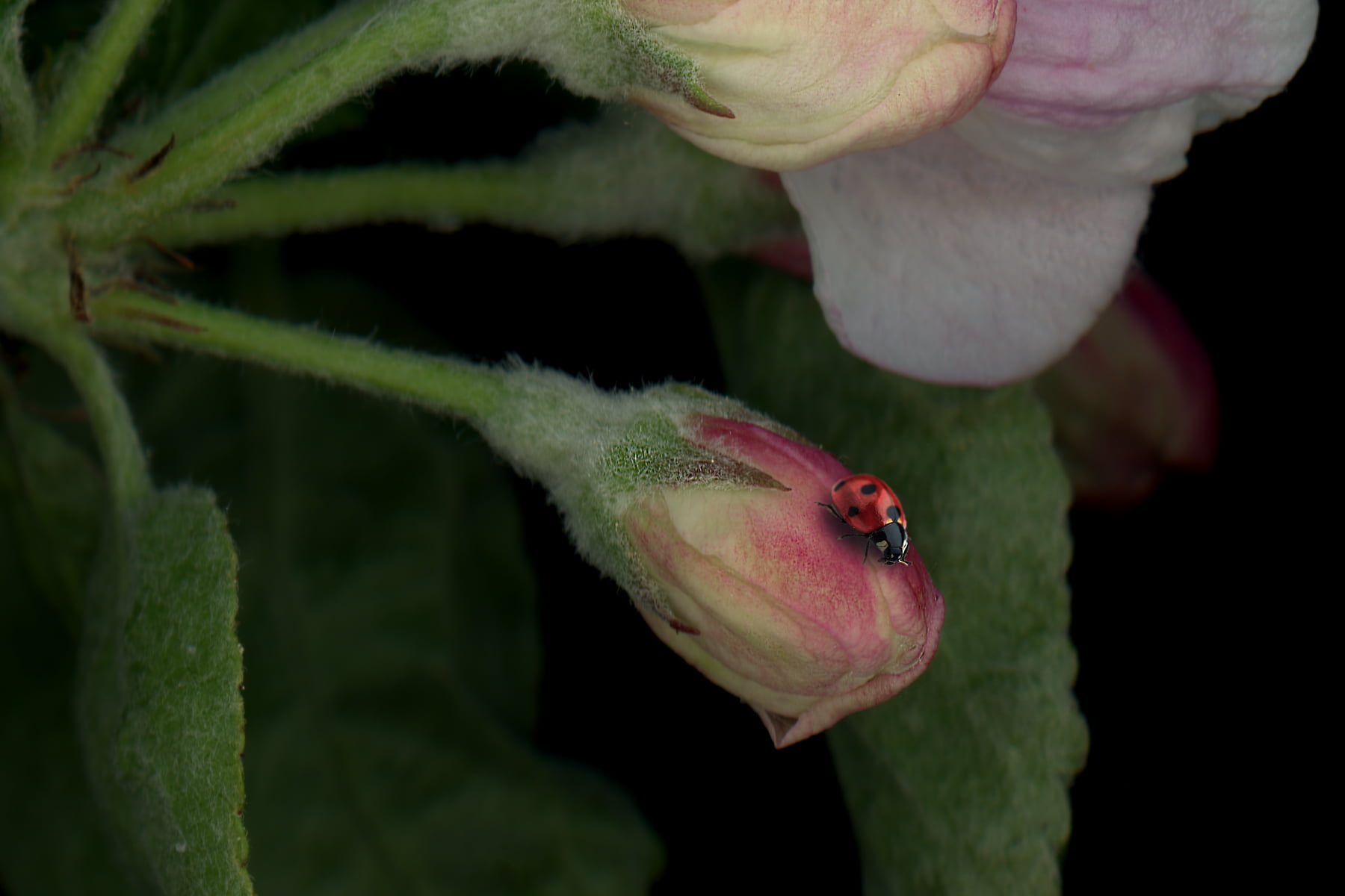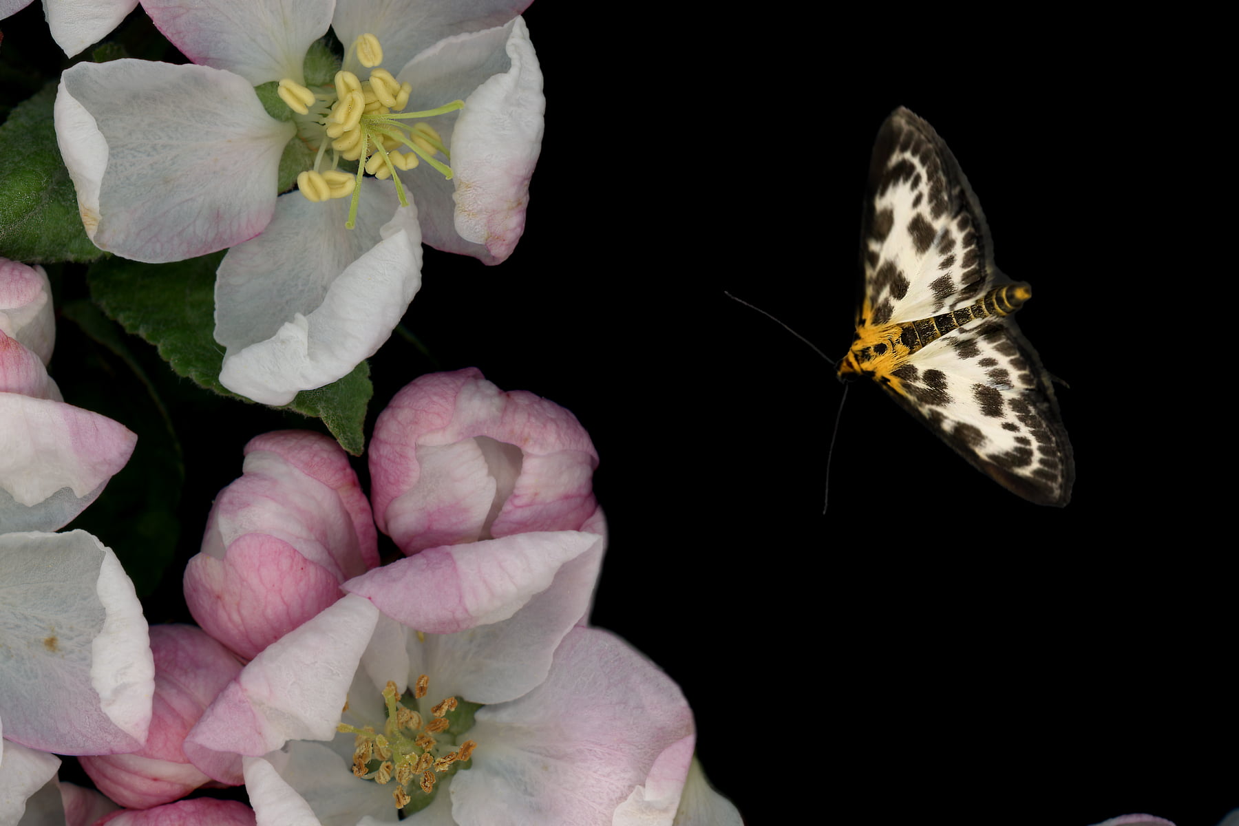 A multilayered botanical portrait of a singular moth fluttering above apple-blossom, at night.