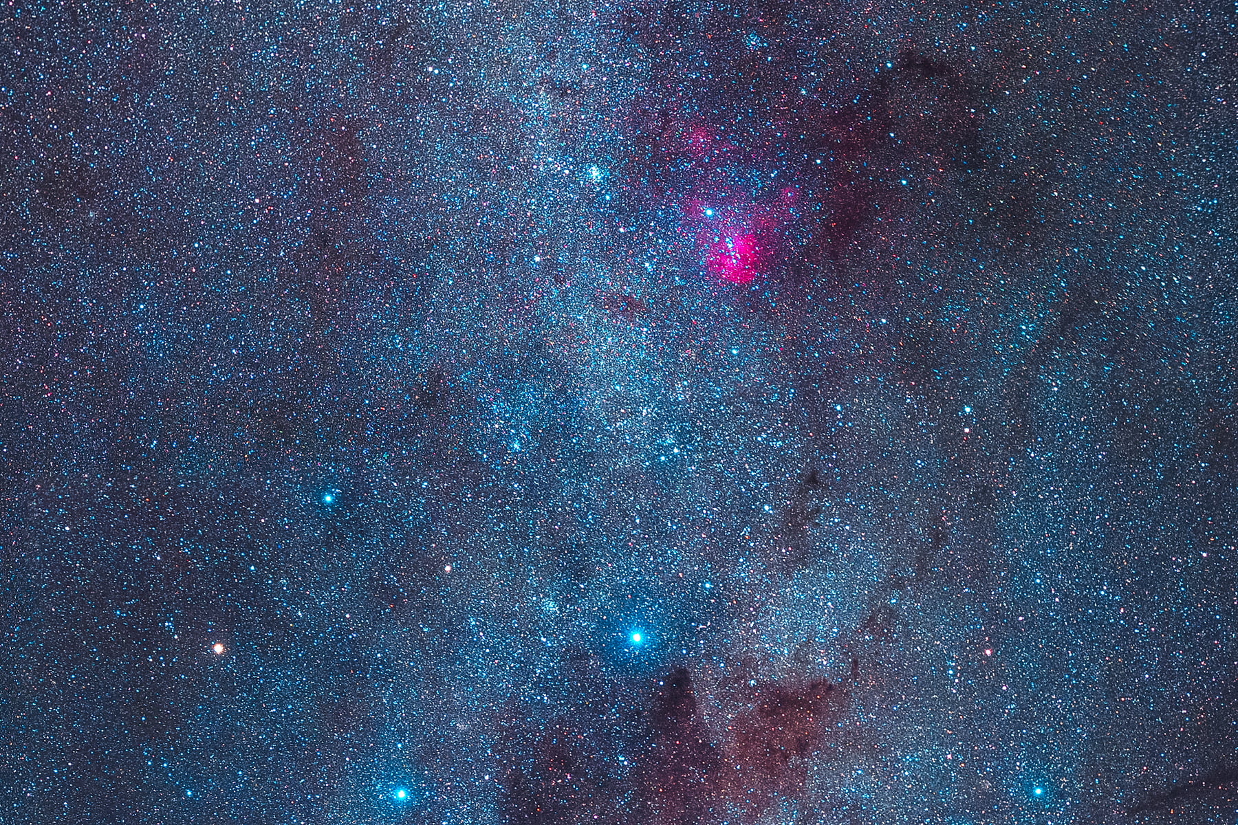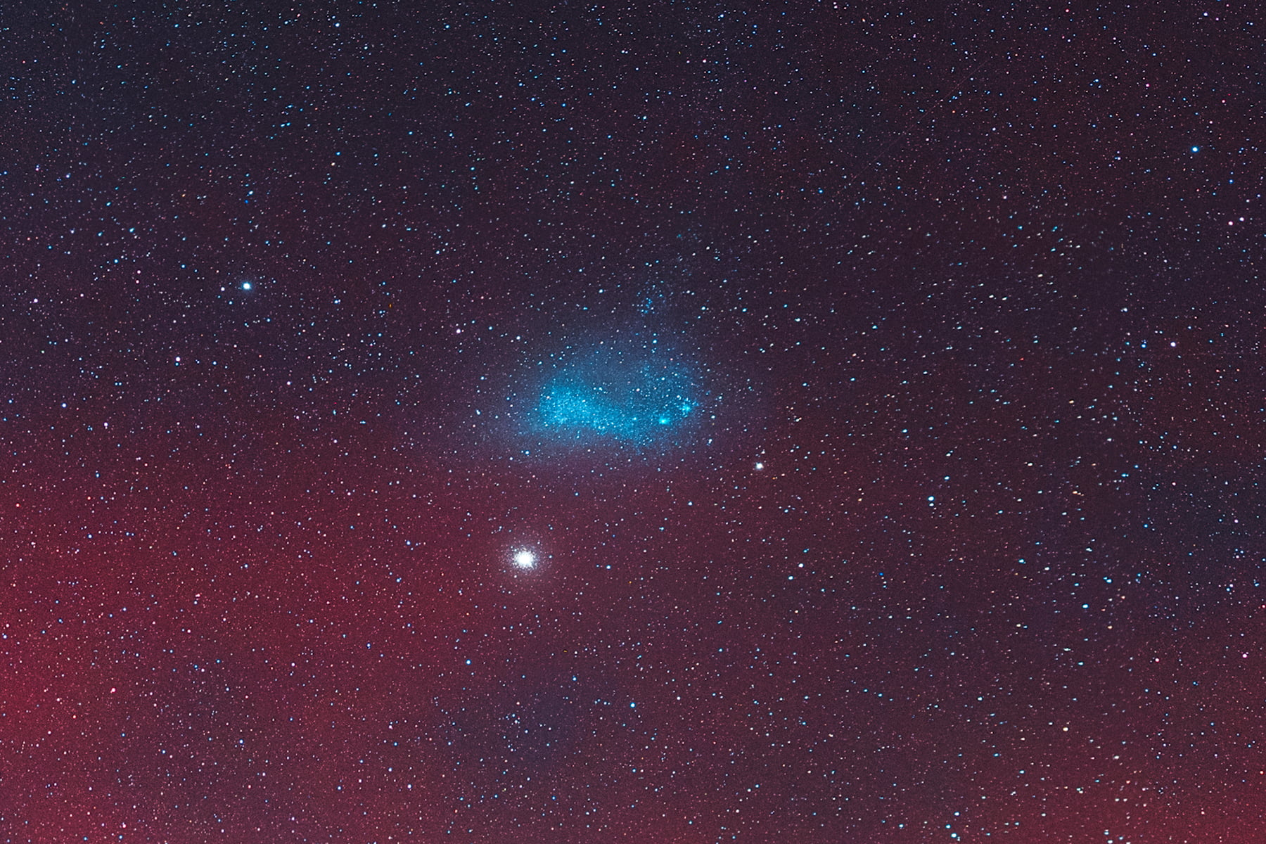 The Carina Nebula can be seen at the top of the sky, Large Magellanic Cloud to the right, and some awesome airglow from atomic oxygen excitation near the horizon.