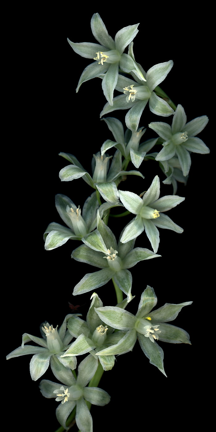 A portrait of Ornithogalum nutans -The Drooping Star of Bethlehem. A fragrant-shade lover, blooming in a pale greenish-white with silvery grey petal margins.