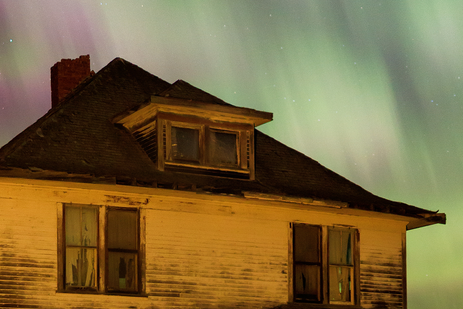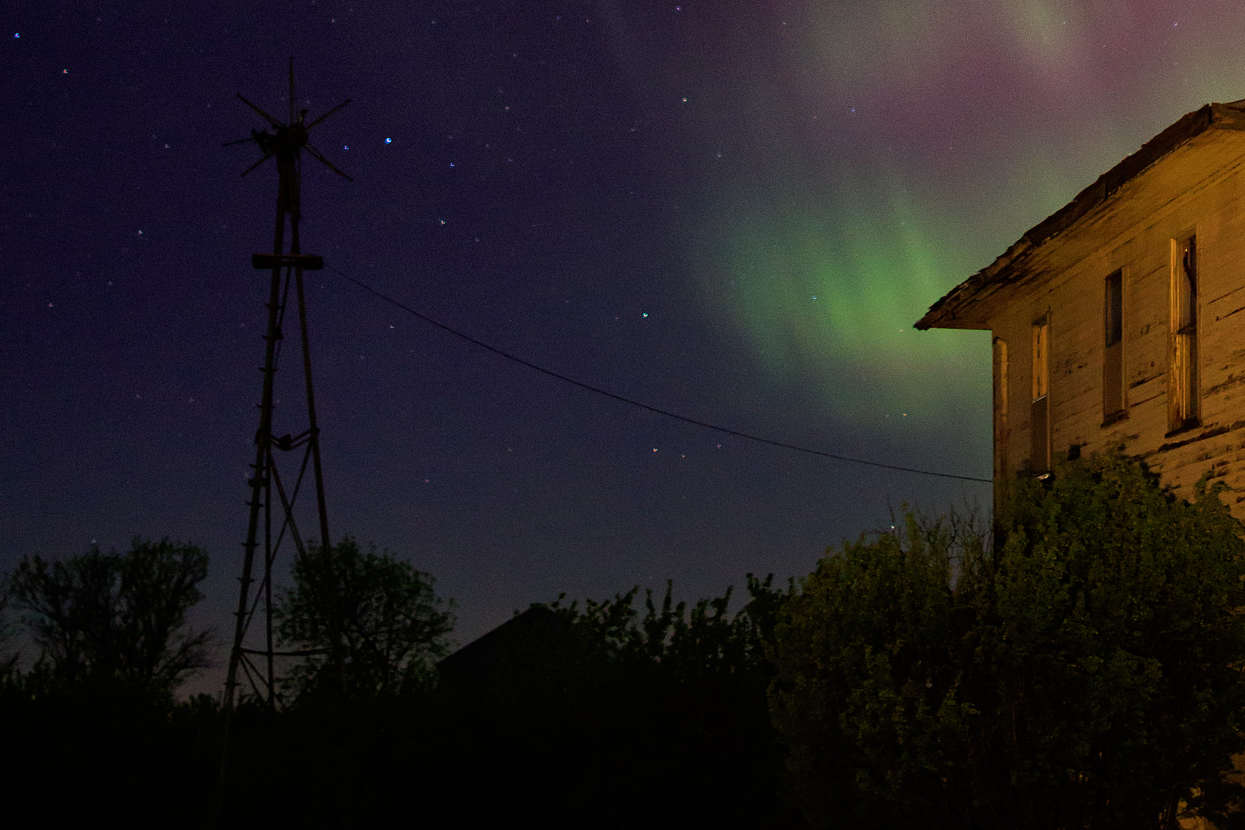 Once there, I grabbed the special equipment I needed to create a VAST photo and set it up in front. The lightshow did not disappoint; it was as active as any I have ever experienced. I used a flashlight to illuminate the old farmhouse and let the aurora take care of illuminating the sky with green and purple.