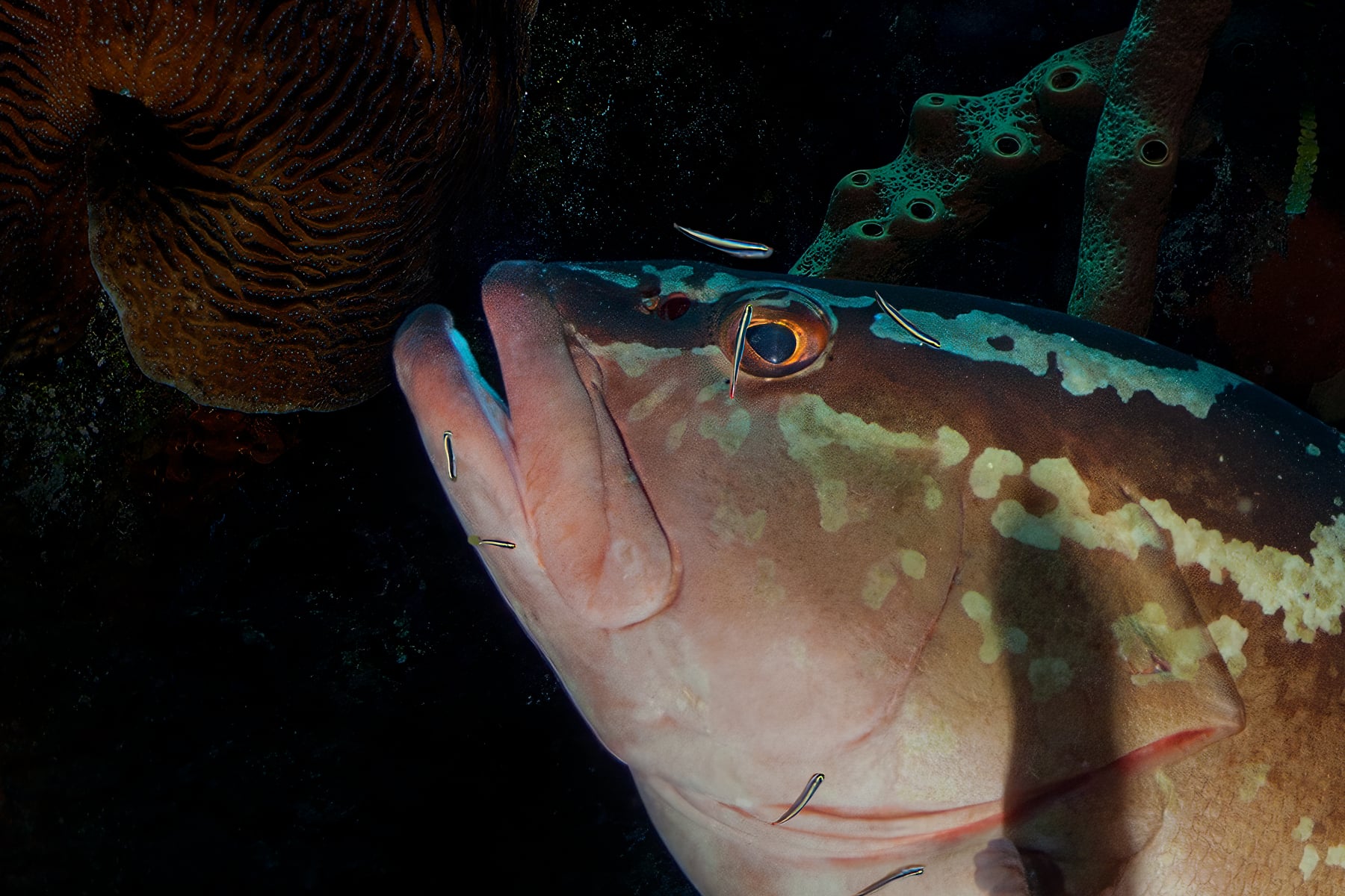 A Nassau Grouper looms in the foreground and a diver looks down from above as a Tiger Grouper rests at a “cleaning station”, being groomed by Yellow Stripe Gobies, Fairy Basslets and cleaner shrimp. The Nassau is being cleaned too, a common site on the steep coral reef walls at Bloody Bay Marine Park in Little Cayman.