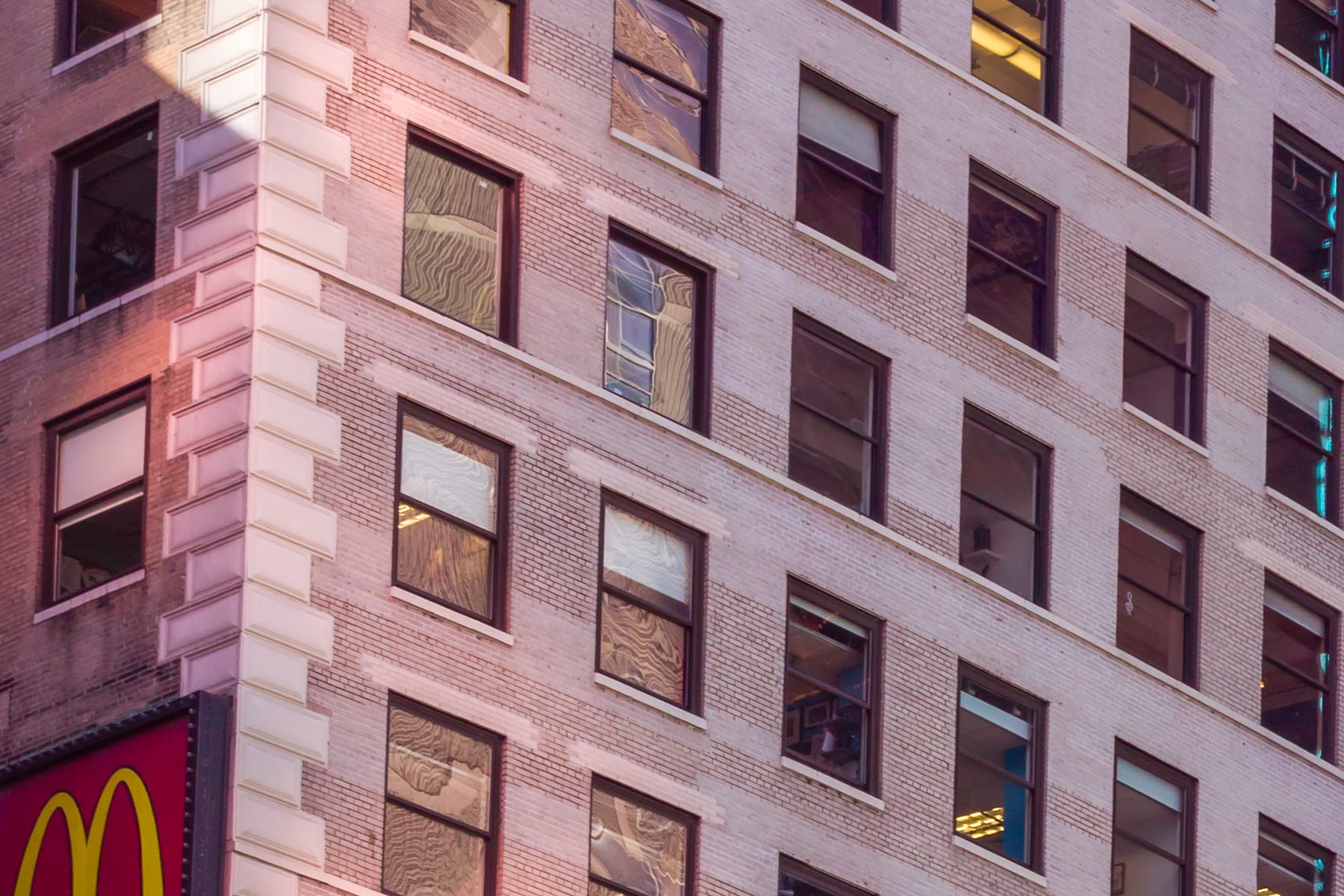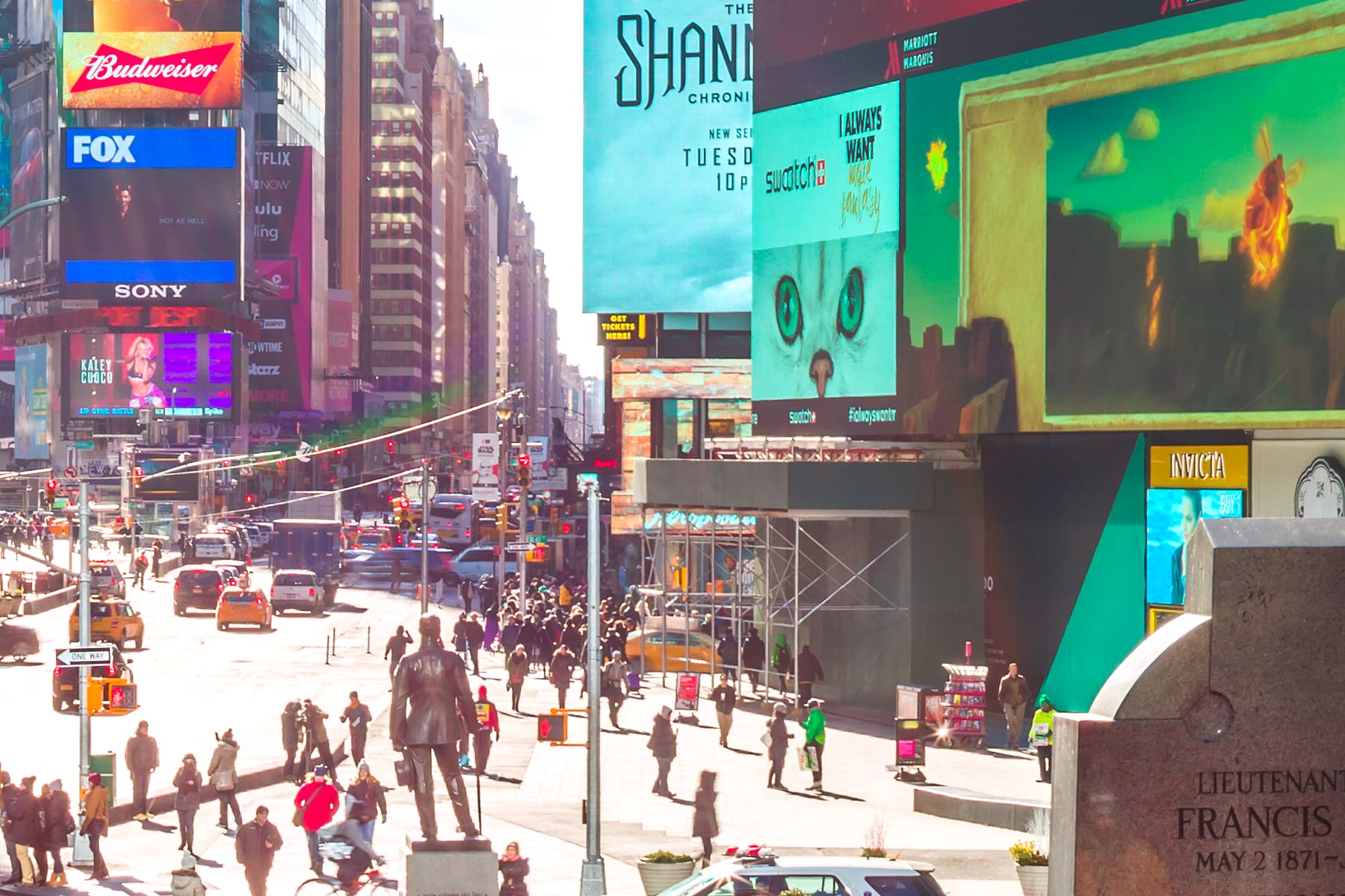 This vibrant panoramic photograph captures the essence of Times Square in New York City, one of the world's most iconic and bustling intersections. The image is alive with colour and energy, showcasing the myriad billboards, neon lights, and advertisements that define this urban hub. The towering buildings, adorned with dynamic signage, create a visually stimulating environment that captures the spirit of New York City.