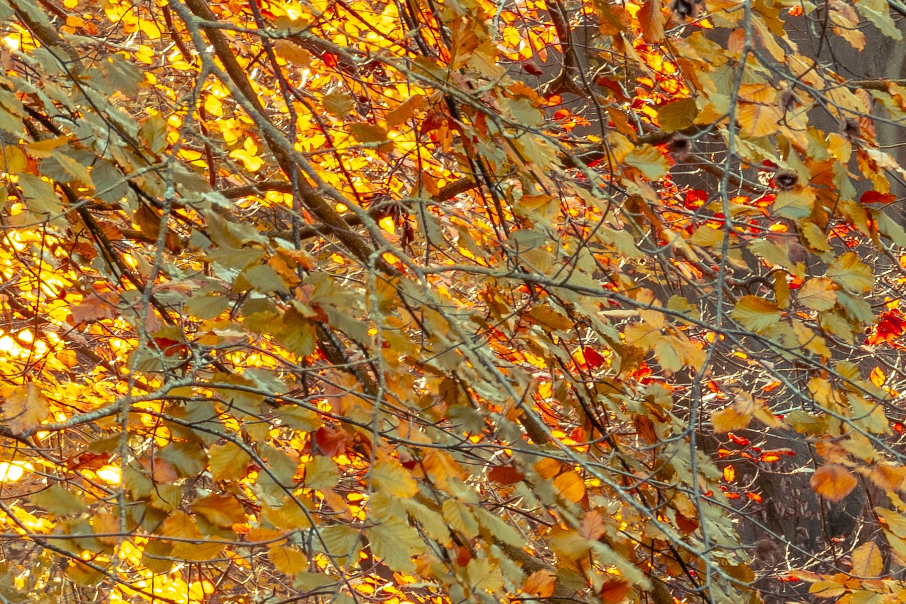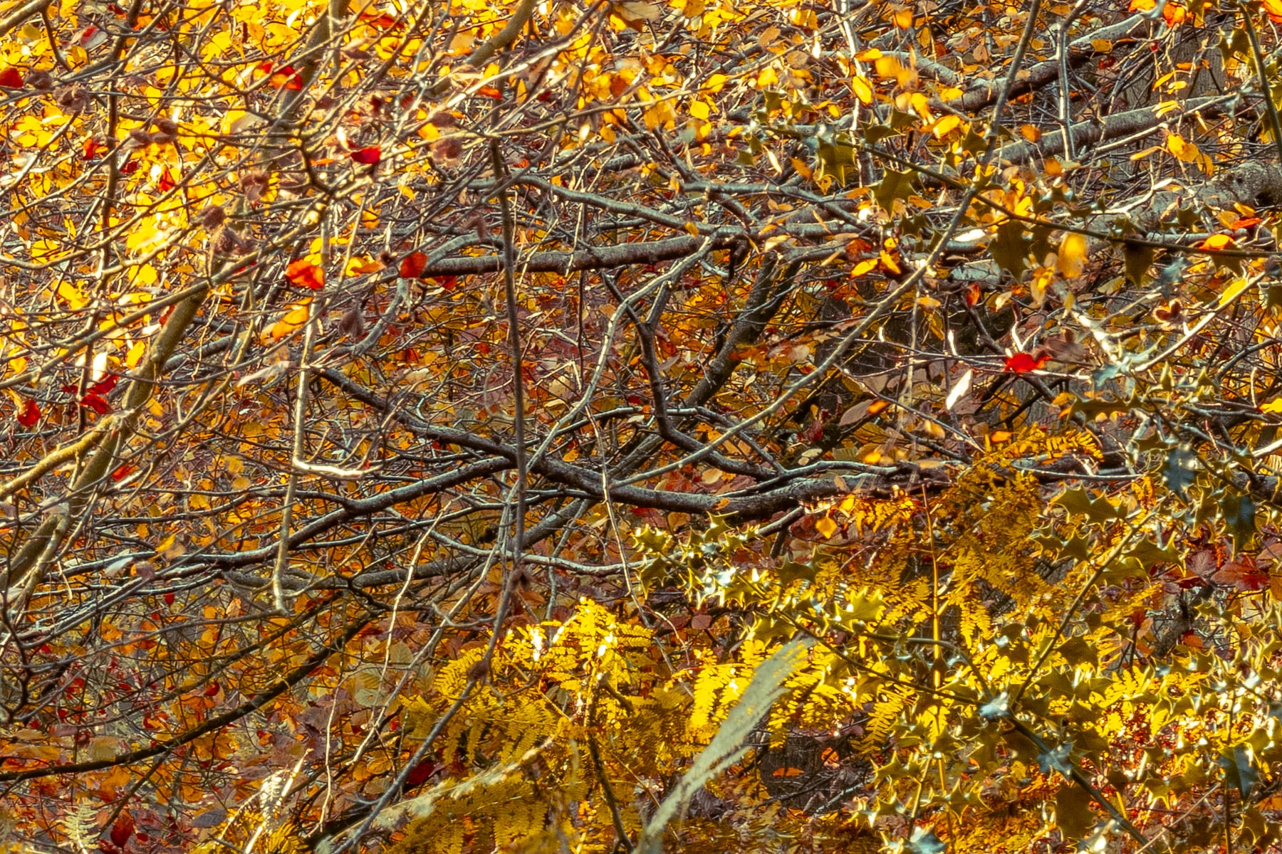 On either side of the trail, dense foliage and graceful ferns frame the pathway, adding texture and depth to the composition. The sunlight plays through the branches, casting a mesmerizing interplay of light and shadow that highlights the intricate details of the leaves and tree trunks. The soft golden glow, combined with the crisp autumn air, creates an atmosphere of serenity and quiet reflection, perfect for a peaceful walk or an escape into nature.