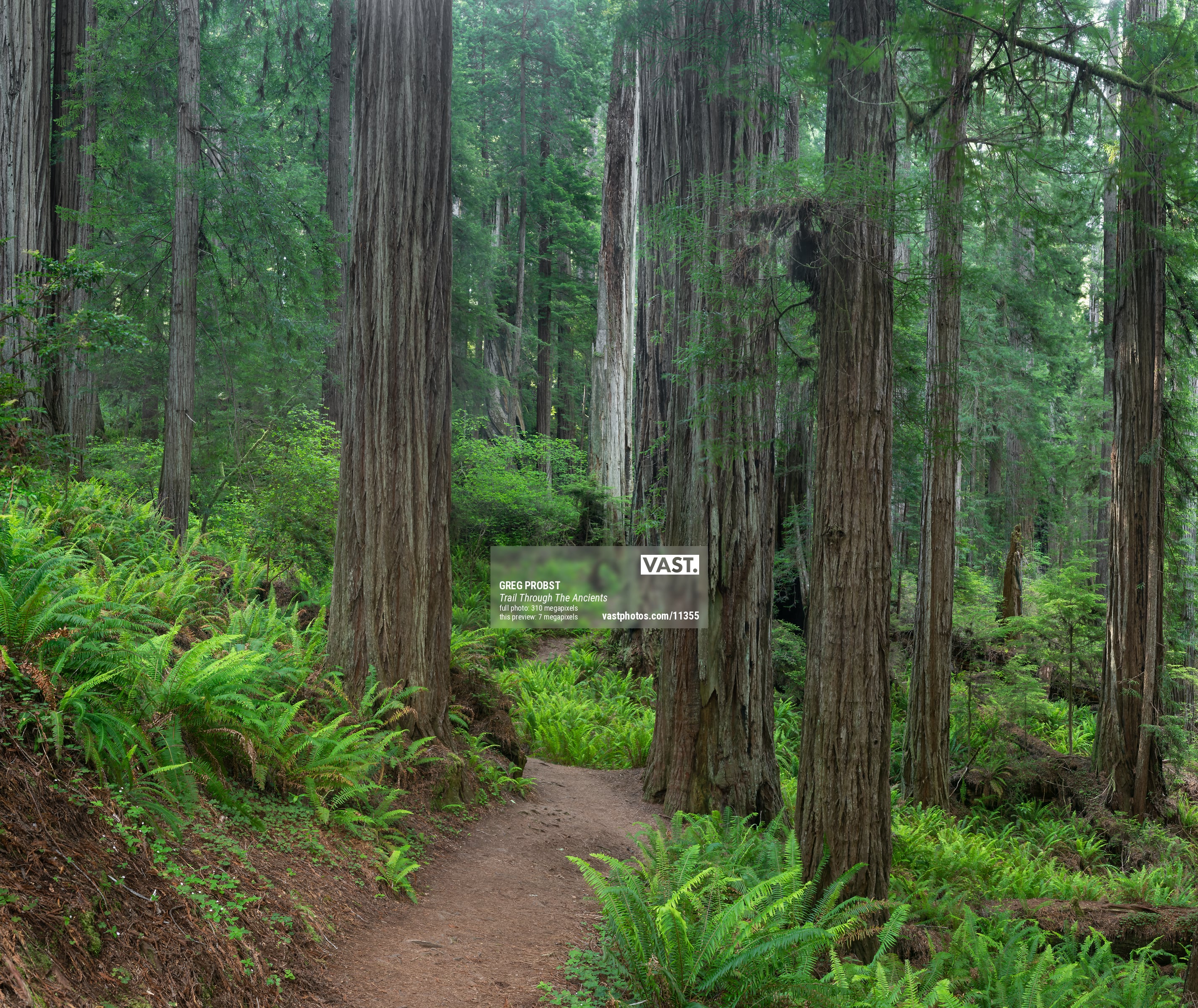310 megapixels! A very high resolution, art photo print representing hiking along a trail in a forest with redwood trees; nature photograph created by Greg Probst in Prairie Creek Redwoods State Park, California.