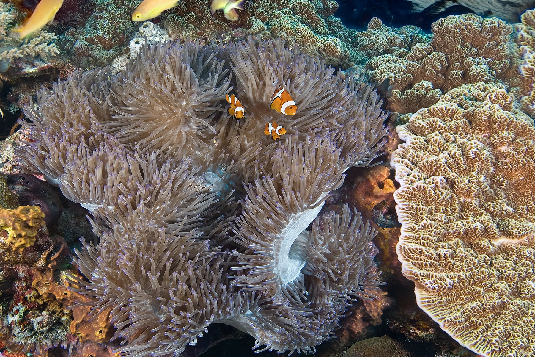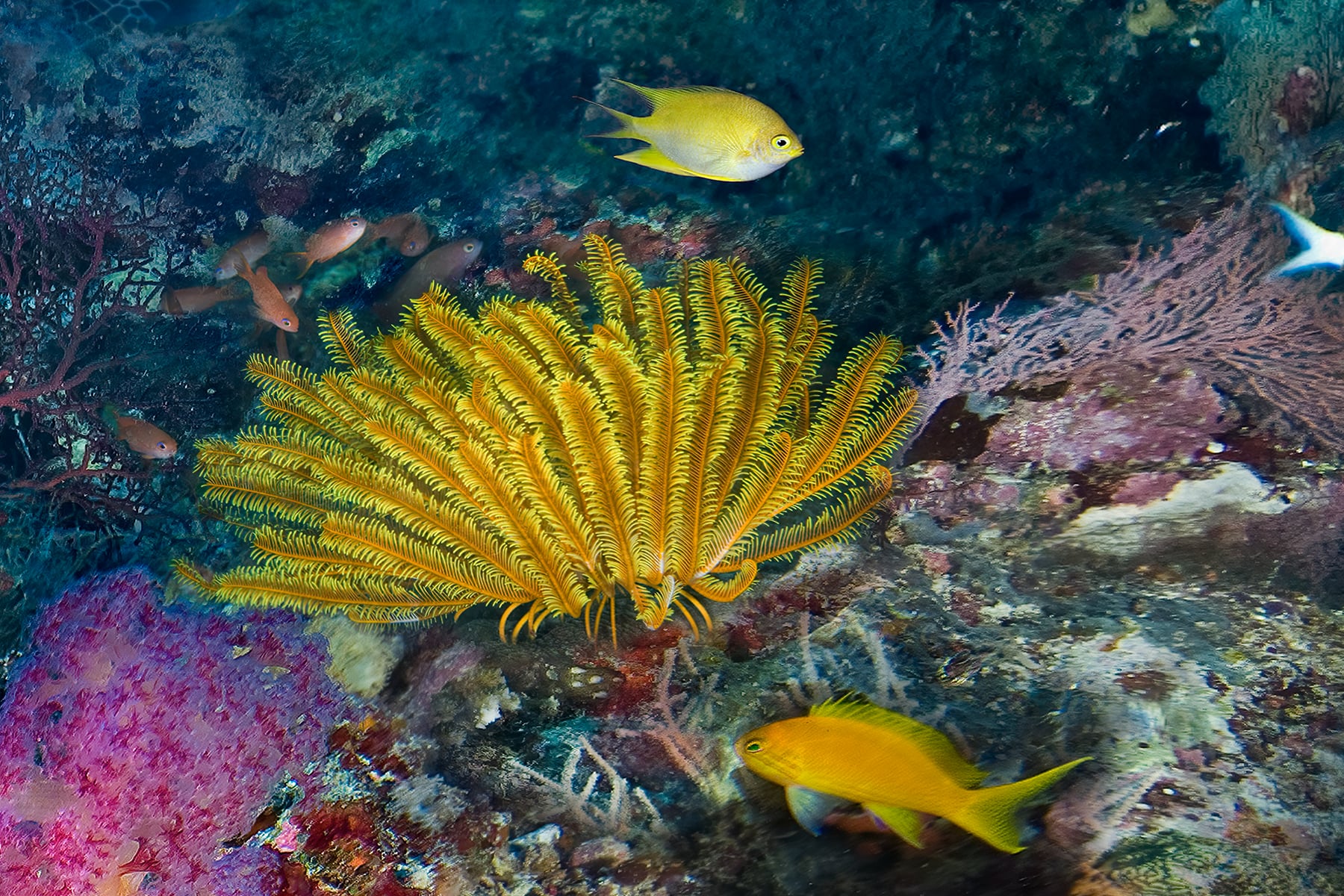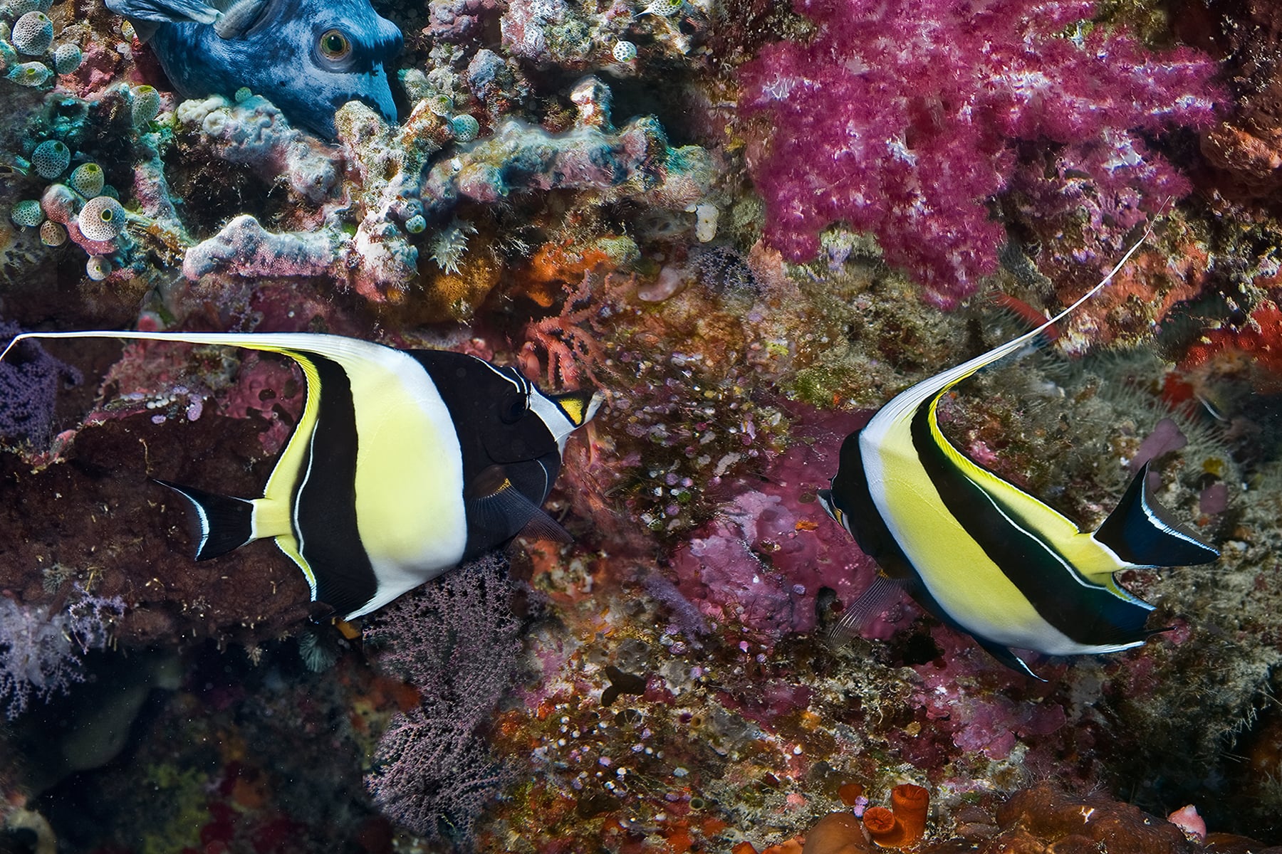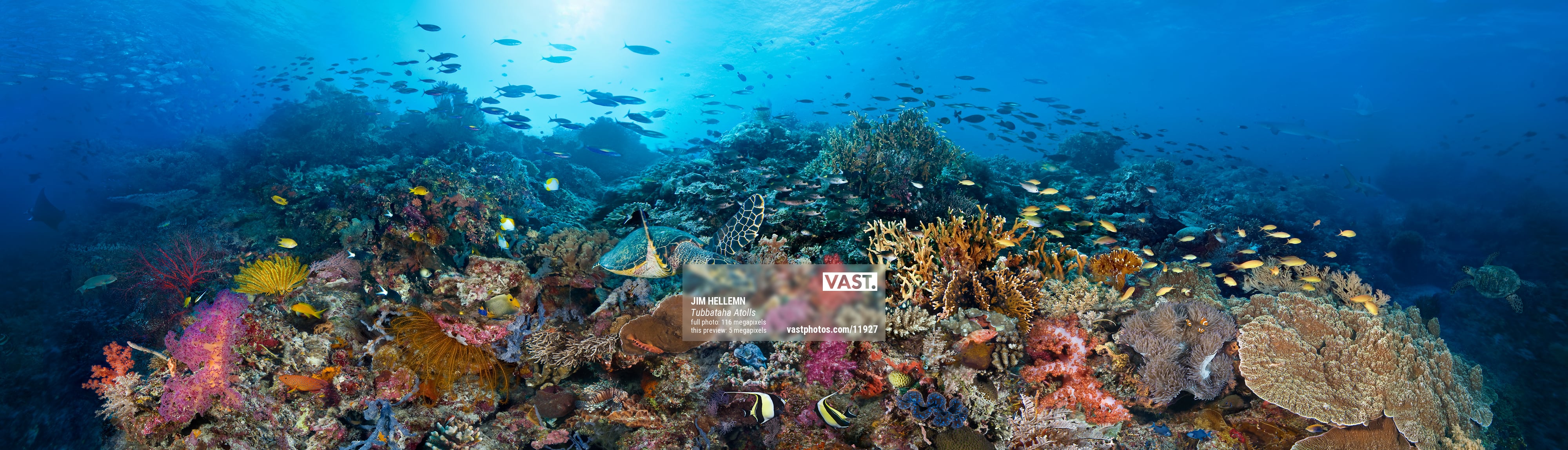 At Tubbataha Atolls, a Unesco World Heritage site in the middle of the Sulu Sea, huge schools of fish surround a pristine reef covered in candy colored soft corals. This 498 megapixel image was captured in 50 individual frames resulting in exceptional resolution. Even in print sizes over 120 inches, extreme details, from tiny colorful reef fish in the foreground to reef sharks and schooling “Big Eye” jacks in the distance.