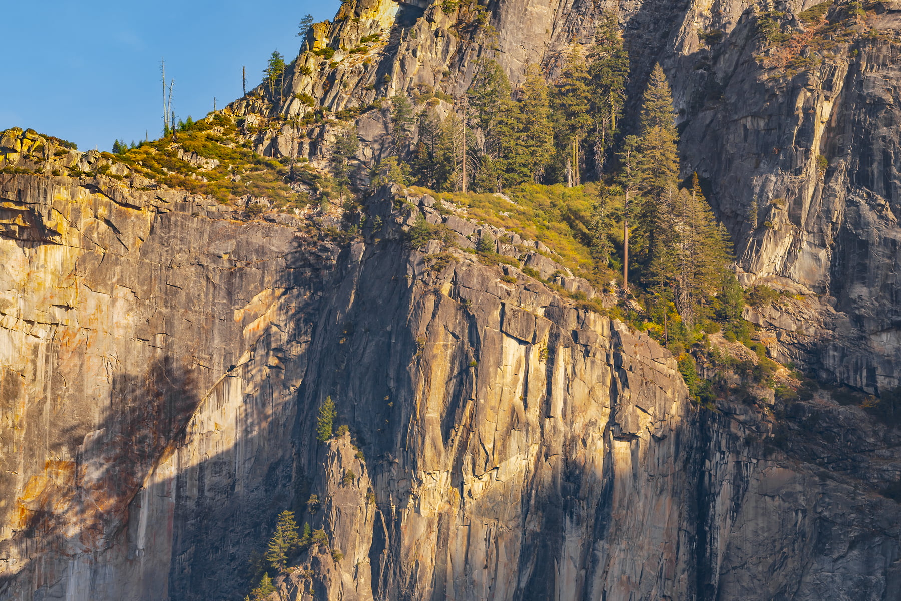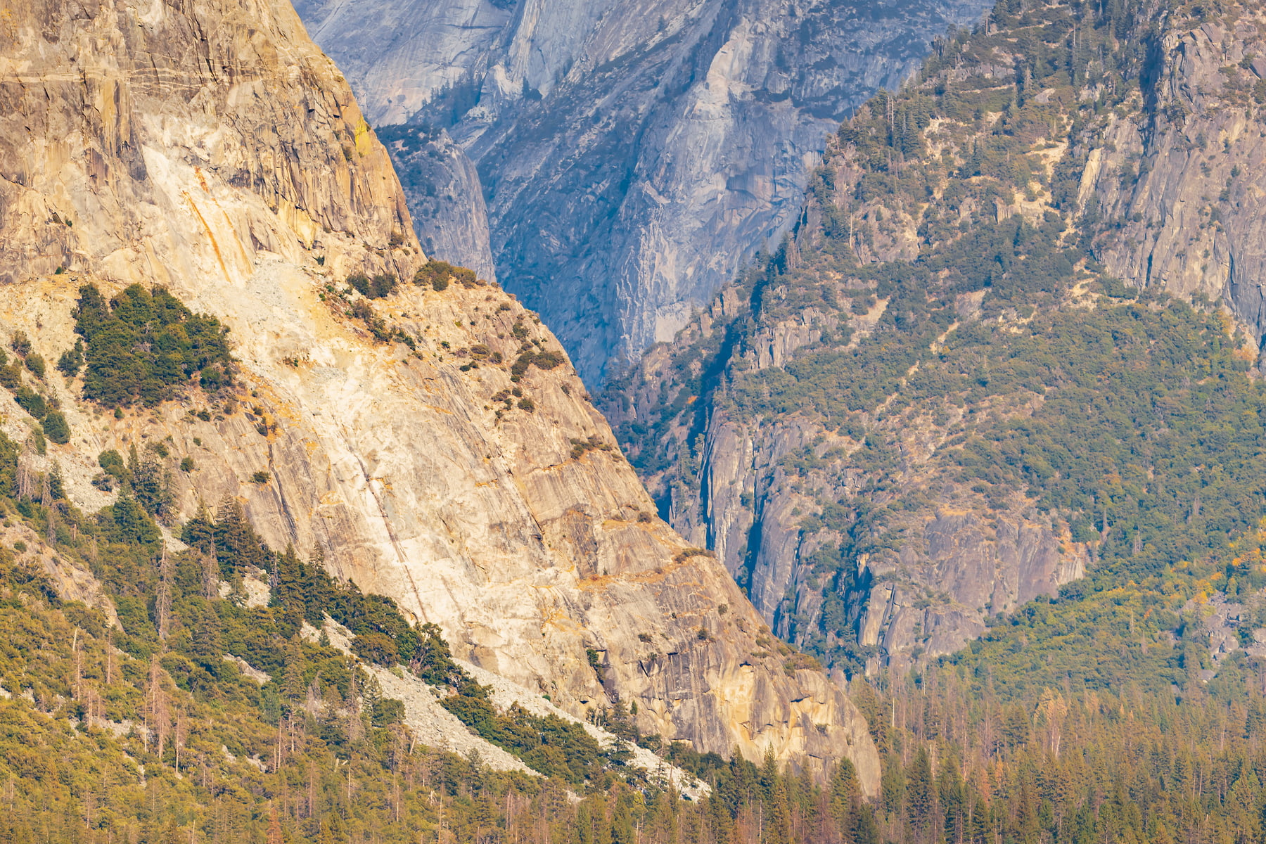 Tunnel View point in the late afternoon, shadows have started to creep into the valley. A few fall colors are showing and Bridalveil Falls is just a wisp whipped by the breeze with the low flow rate of Bridalveil Creek in mid Oct. The waterfall is 617 ft. (188 metres) in height and flows year round.