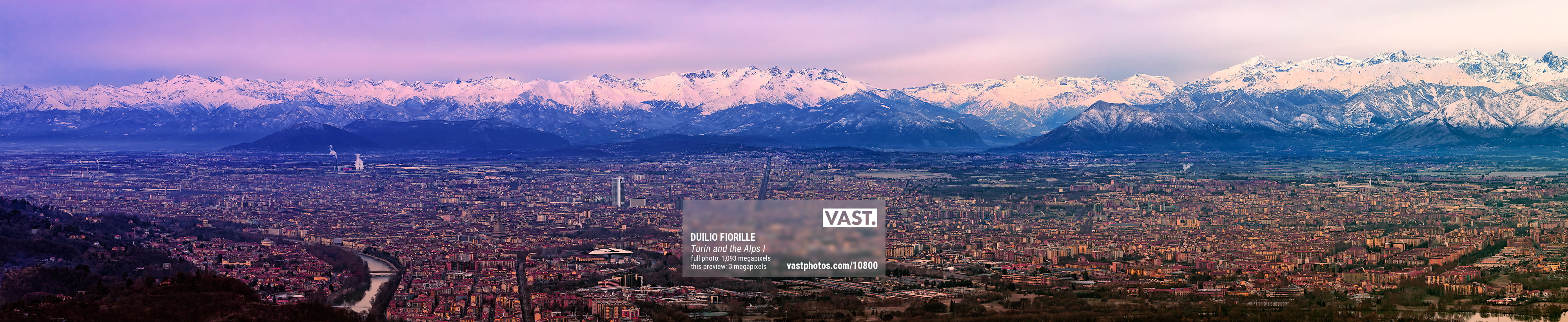 To make the view of these beautiful mountains adequate, I wanted to create a series of VASTphoto, of which this is the first photograph. I chose the highest and most panoramic point of the city, from the 700 meters of altitude of the Superga hill where the huge basilica of the same name resides. From the top of this hill the view is unique and spectacular, as you can see from the photo. It is possible to see the entire city and all the villages surrounding it with a single glance over a radius of over 100 kilometers in width and about 50 in depth. All the main buildings and the great straight avenues of the city are clearly visible, from the spire construction of the Mole Antonelliana, its symbol, to the new and modern skyscrapers, up to all the historic buildings of the Savoy. On the other hand, the main alpine peaks stand out on the mountains, including Gran Paradiso (4061 meters high), Monviso (3841 meters high), Rocciamelone (3538 meters high) and many other peaks, a destination for mountaineers and hikers.