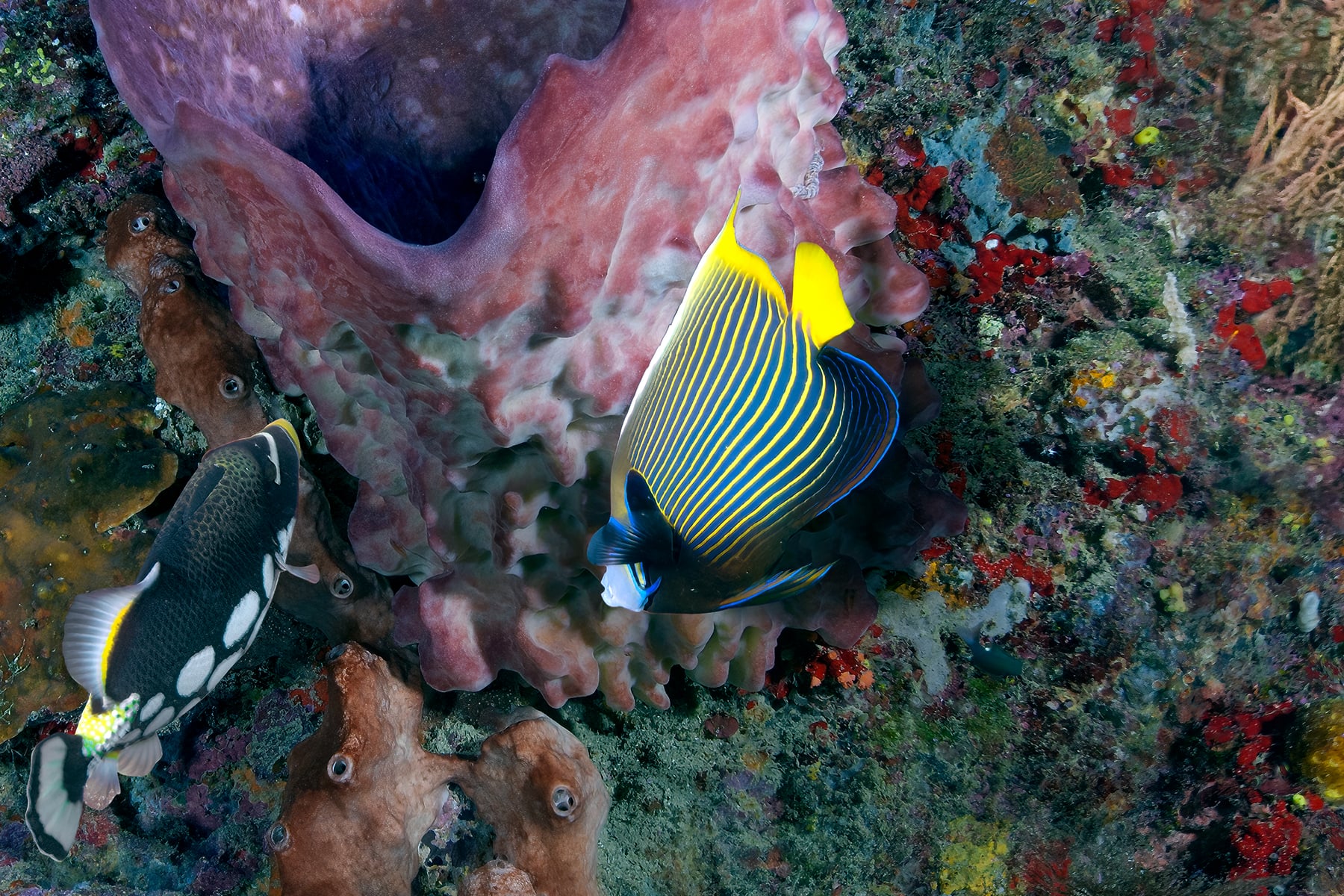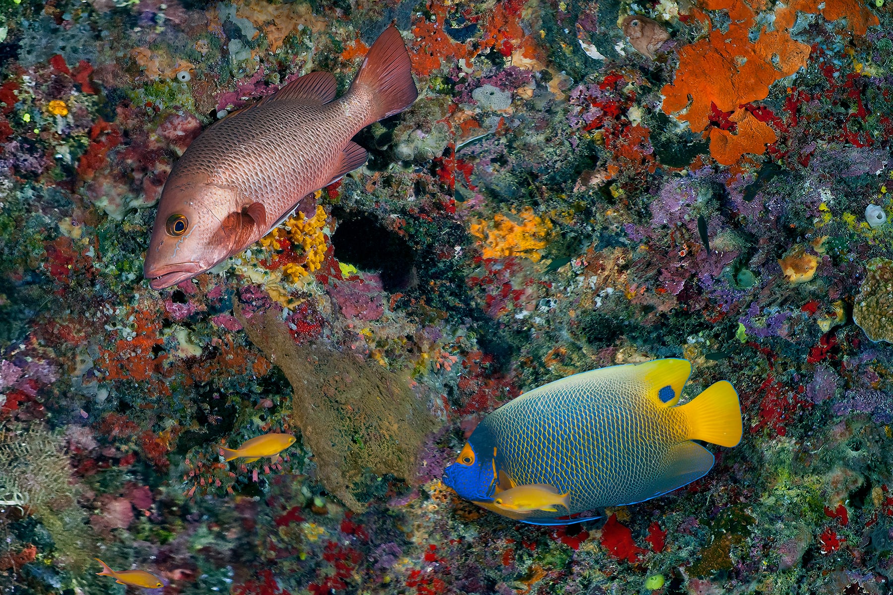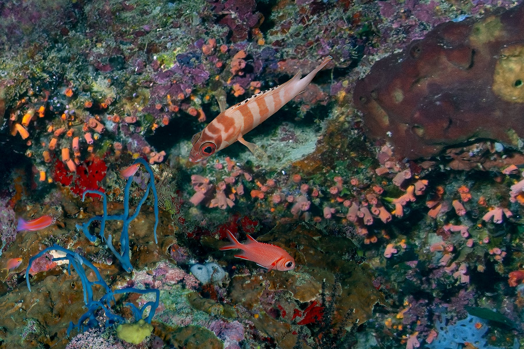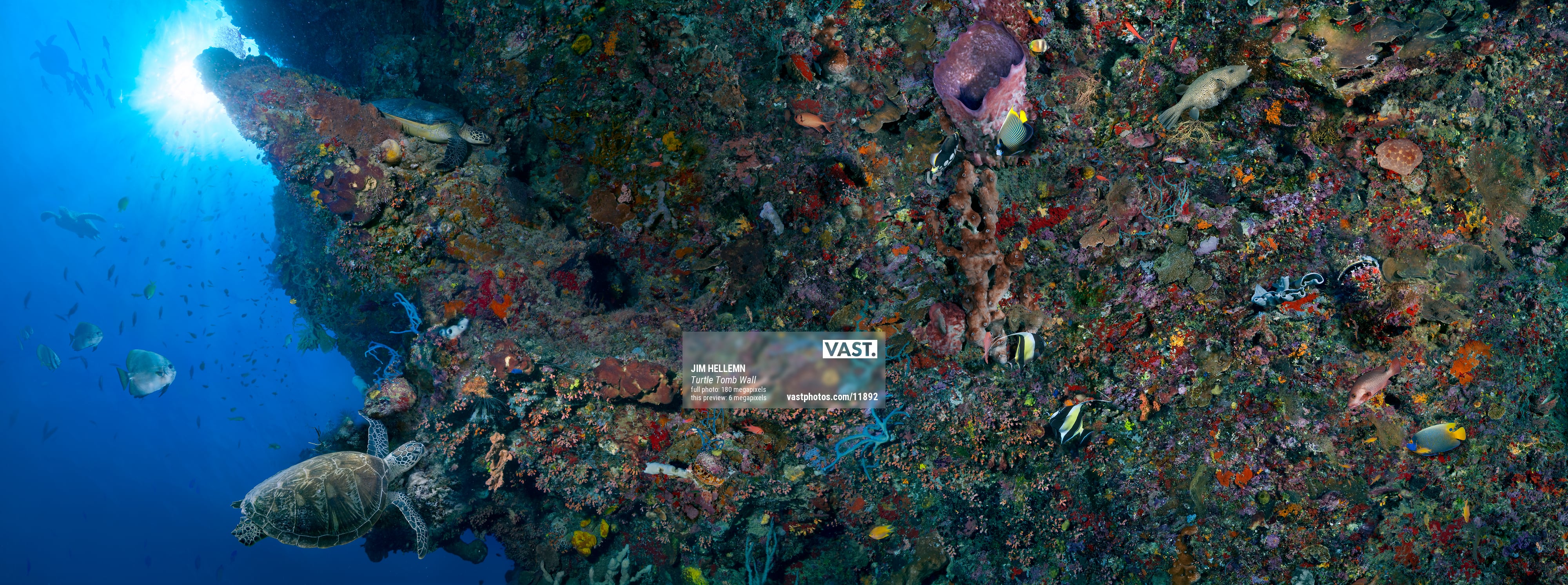 This image is a high resolution mosaic of the vertical reef wall at the entrance to the “Turtle Tomb” at Sipadan Island.