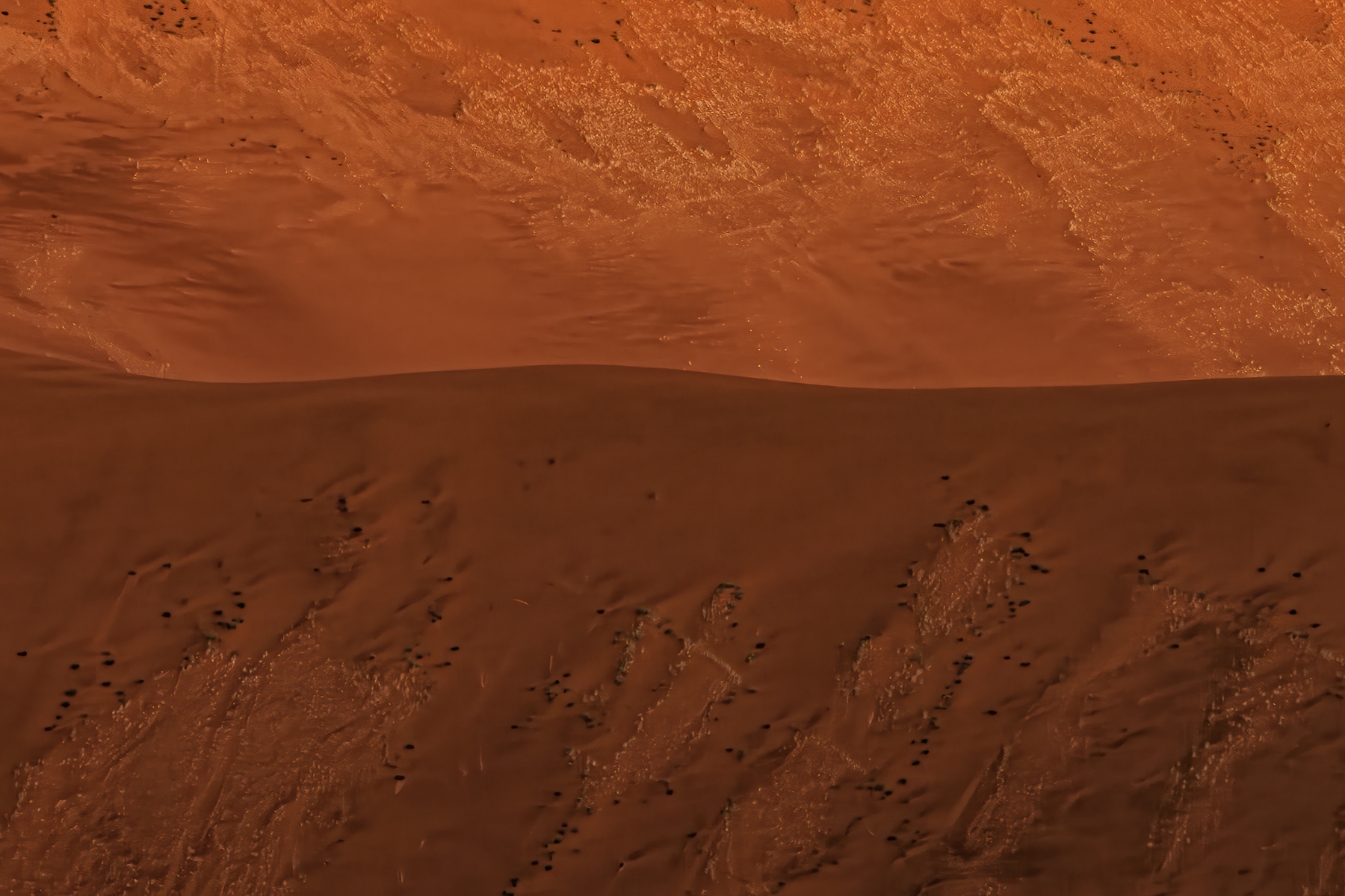 With every click of the shutter, Scott marveled at the precision required to capture the immense beauty around him. His camera and special panoramic gear allowed him to weave together the landscape in ultra-high resolution, each shot meticulously planned to capture just a small segment of the scene with all the shots to be later reassembled to show the vastness of Deadvlei’s unique terrain. The smooth, wind-carved curves of the dunes stretched endlessly into the horizon, their imposing forms flanked by the gnarled silhouettes of dead trees, remnants of an ancient, dried-up riverbed. The challenge was more than just technical; it was about finding harmony in the contrast between the harsh desert light and the intricate textures of the earth, trees, and sky. Scott felt deeply connected to the place as he worked, as if he were not just photographing it, but breathing it in.