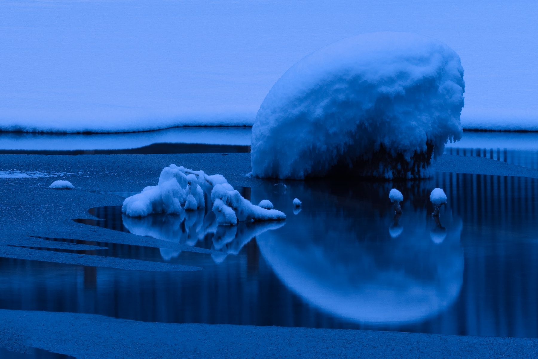 The color of Emerald Lake is most spectacular in July and August when the glaciers containing the sediment melt somewhat in the summer heat. July and August are also busy times with tourists flocking to the area. This image was created at the end of December, a much quieter time at the lake, but also a time with an abundance of snow but open water. Photographed at dusk, with the illuminated lodge reflected in the water, the beauty of the solitude of Emerald Lake is revealed.