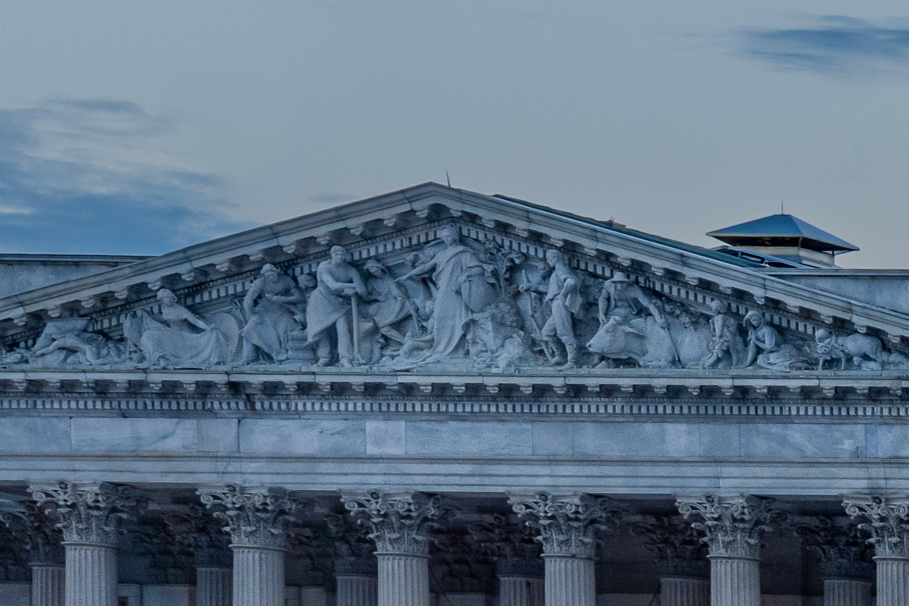 I originally intended to replicate my original wide angle shot in the late afternoon golden hour. I soon realized after having to take the extra time to expose 16-18 images in each position to achieve the full range of focus for what would turn out to be the foreground of the end image, that my “end image” would provoke a different mood altogether as the light changed so dramatically. The image you see is a blend of 45 input images (5 rows of 9 images) taken over the span of an hour and a half, from the golden hour through sunset and the blue hour. The input images were both exposure blends as well as focus-stacked results which yield a final image that maintains focus from the Compass to the U.S. Capitol Building.