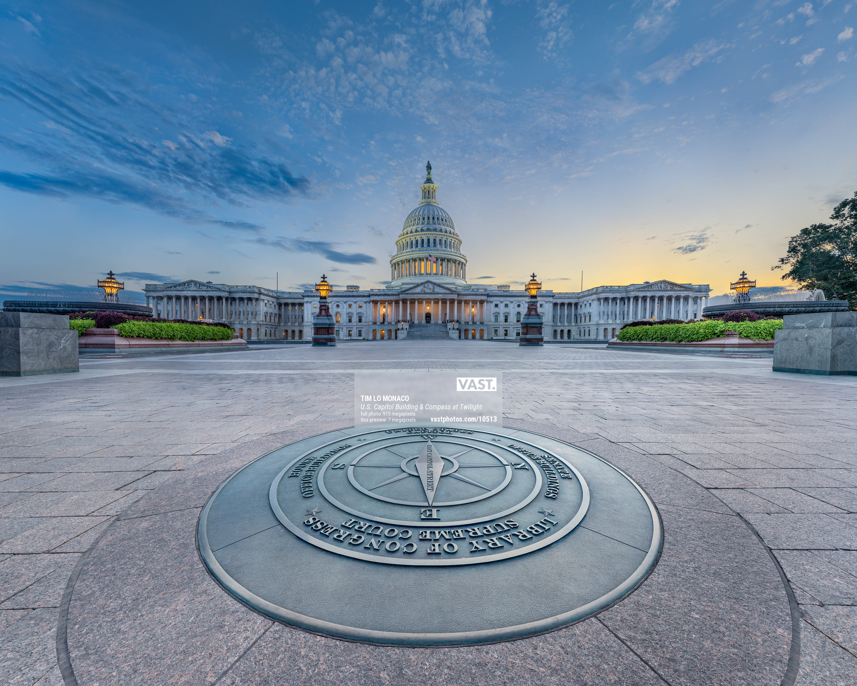 Part of the VAST technique is to not only create an image where a viewer is brought into it via the ability to see the minute details, but to give justice to a beautiful scene by the feeling it evokes. The VAST technique is a labor of love. I could go on for days about the process of making this image, but with the efforts to keep your attention I will sum up the highlights. After sweeping the Compass for 15 minutes to remove every last pebble and debris, I began taking pictures. Soon after, the Capitol Police drove by to tell me I couldn't use a tripod. Nooooo!!!! After some pleading, they yielded, and noted that I had cleaned up the Compass, which was something positive. Who would have known my small dust pan and brush would have saved the day? In fact, this image wouldn't have been possible but for the gracious officers that allowed me to keep my setup for long after my promised finish time.