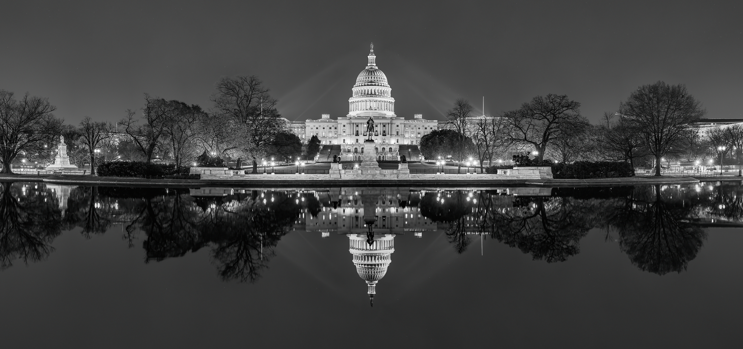 I still went home feeling utterly redeemed that I captured a great reflection. I knew both that it was going to be a nightmare to process, and that somehow, I’d figure it out. Months later I was able to sit down and dedicate the embarrassing amount of time I needed to put this all together. Like my Union Station Main Hall image, focus-stacked images of architecture create parallax and therefore make it extremely cumbersome to “stitch” together. I often-times get caught up with the technical aspects to capture a challenging scene like this. Now that I’m finished, I can look back and enjoy the view that inspired me to put in the many hours to get this photo in the first place. Literally every time I go there, I’m in awe of the sheer size and grandeur of the U.S. Capitol Building. The reflecting pool is at its calmest at night and there are little-to-no people, providing a serene experience. It is a rare treat to see this grand building and its reflection with no wind and calm waters. I can only imagine the vision and collaborated efforts needed to realize the creation of this reverent monument.