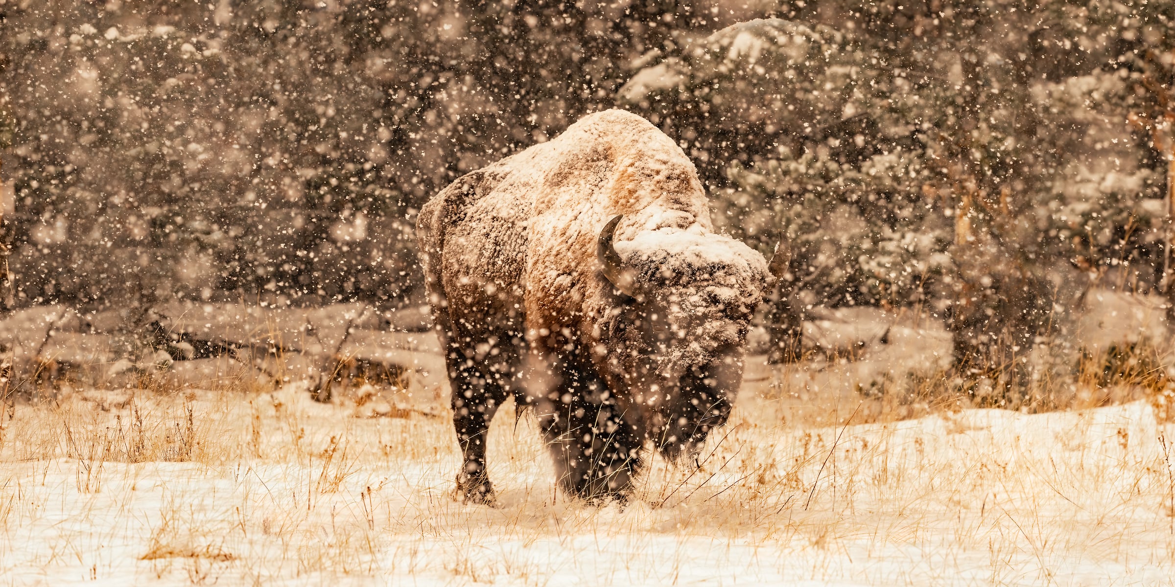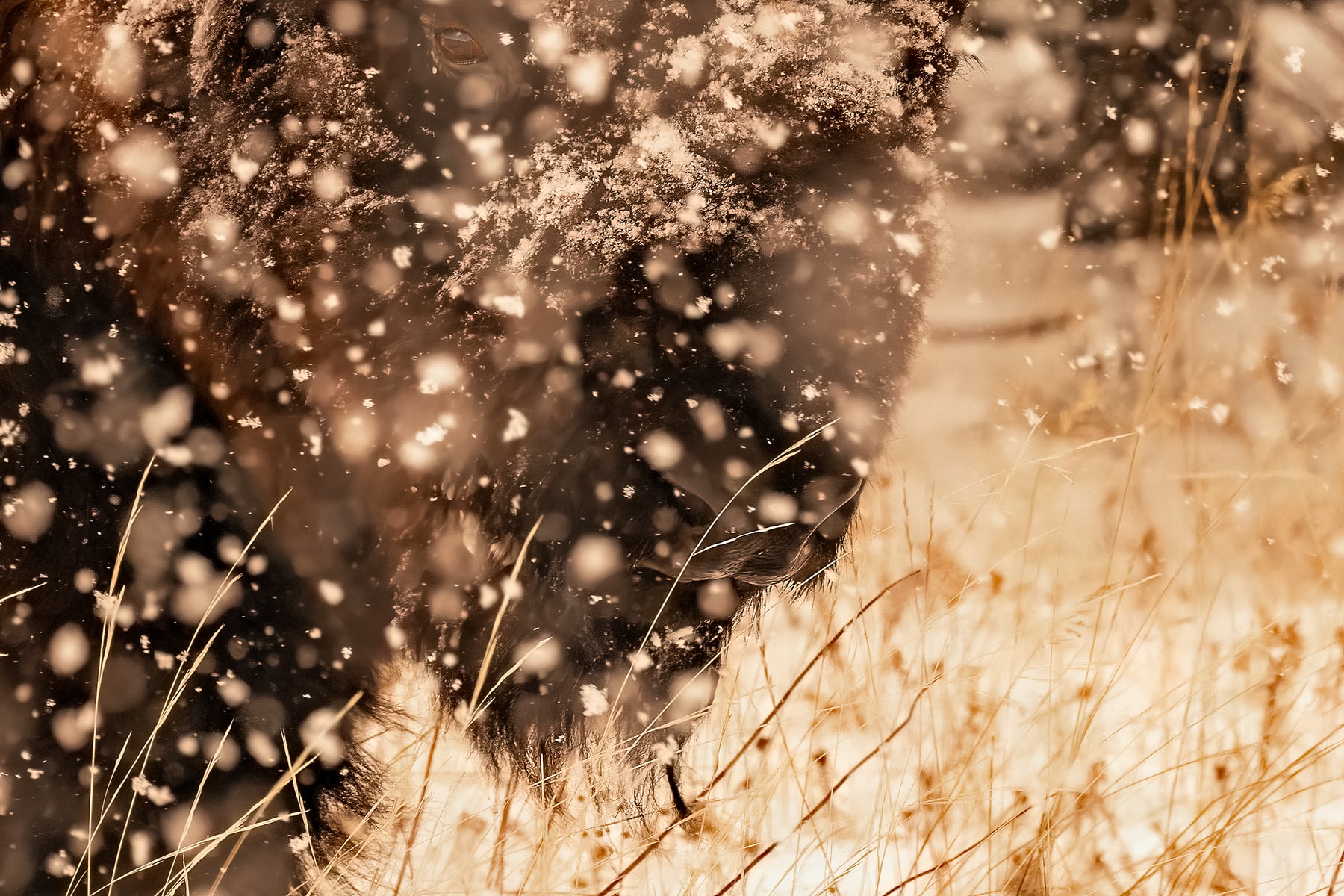 Months later when I got around to processing this image, I was at first disappointed with the results. It looked like the whole thing was a bust. The problem was, it appeared that not a single one of the hundreds of photos taken had the bison in focus. It was snowing so hard, and the flakes were so large, that the camera was continuously focusing on the falling snow. There are ways to avoid this, and I tried my best, but it appeared to have been in vain.