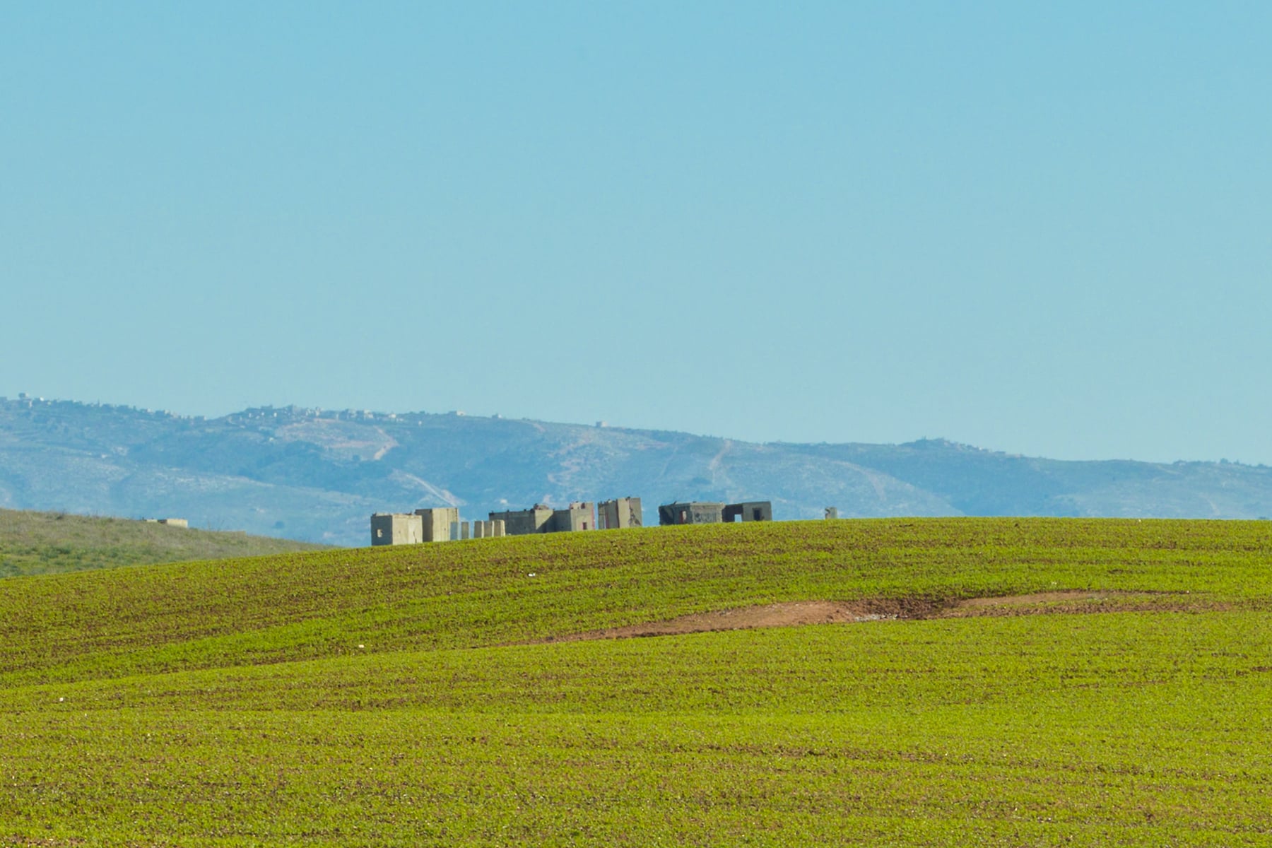 This panoramic photograph captures the serene beauty of a green field under a clear blue sky in Ahuzam, Israel. The vast expanse of lush, rolling fields stretches towards the horizon, creating a sense of openness and tranquillity. The vibrant green of the young crops contrasts beautifully with the deep blue of the cloudless sky, highlighting the freshness and vitality of the landscape.