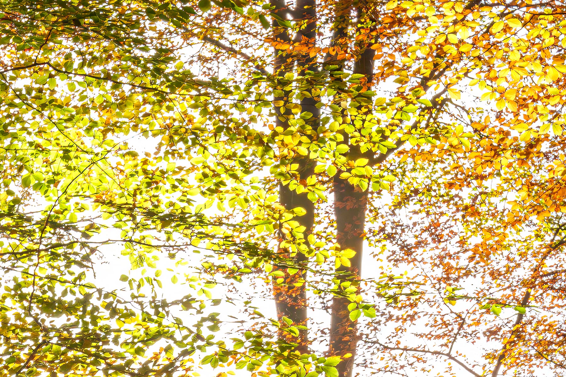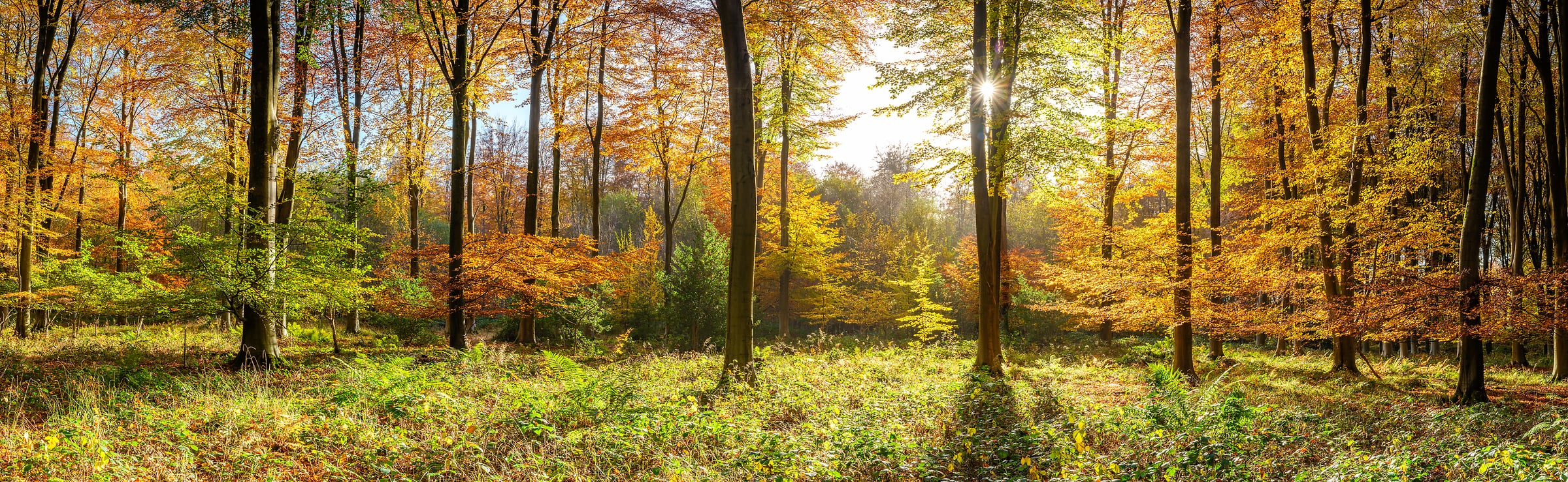 A breathtaking autumn forest panorama bathed in golden sunlight showcases the beauty of nature’s seasonal transformation. The towering trees, adorned with vibrant hues of orange, yellow, and red, stand majestically against a clear sky. Sunlight filters through the dense canopy, casting long, dappled shadows on the forest floor. The lush greenery contrasts with the warm autumn tones, creating a harmonious balance between summer’s remnants and fall’s embrace.