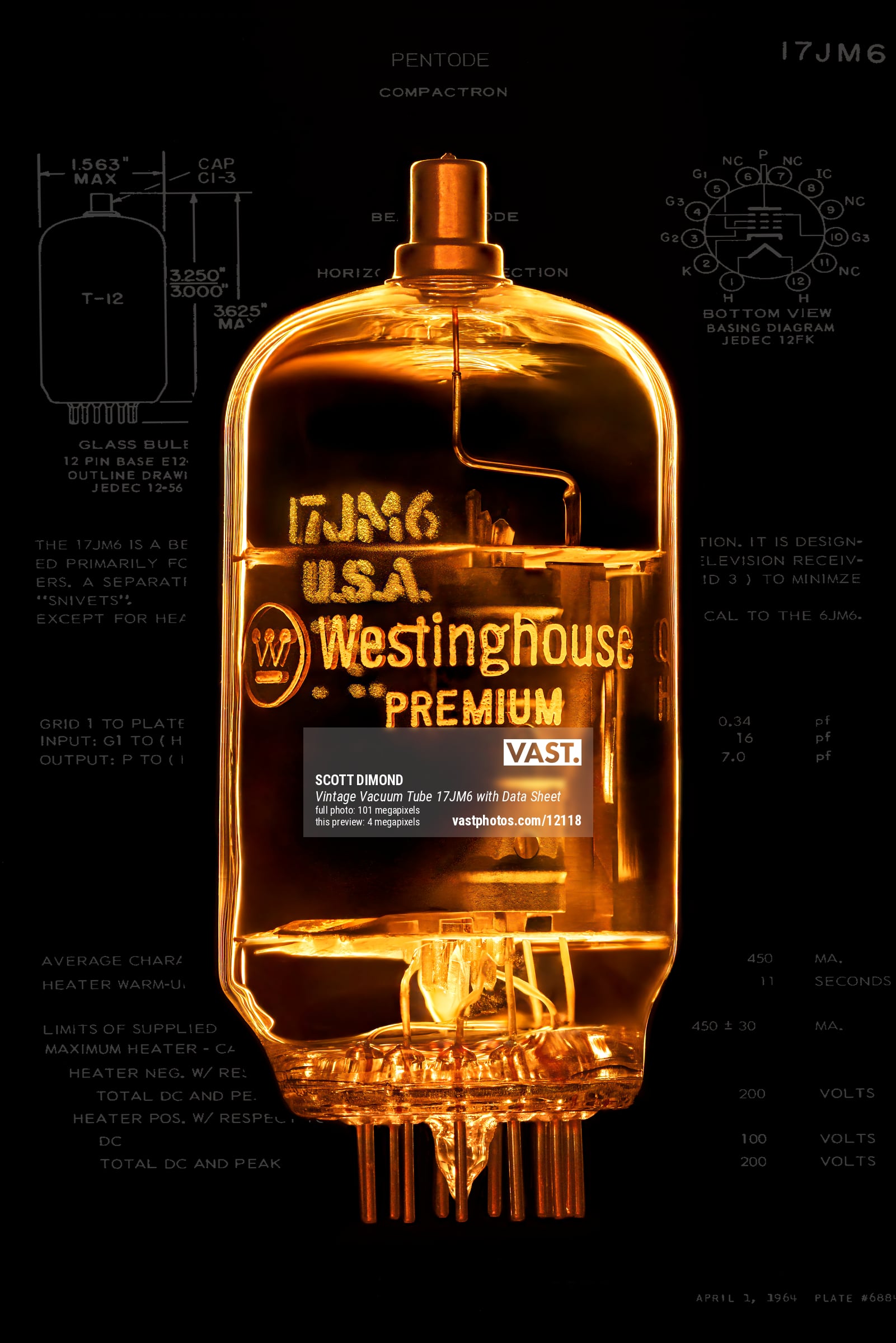 Photographer Scott Dimond had always thought that vintage vacuum tubes would make a great photographic subject, but he never pursued the idea until he came across a treasure trove of old tubes at a 2nd hand store. The result is an ongoing project showcasing vacuum tubes using various photographic techniques including backlighting, light painting and focus stacking. Where possible, Scott also energized the heating cathode within the tubes using a laboratory power supply. To determine which pins at the base of the tubes were used by the heating element, he needed to identify the tubes and then research them to find the manufacturer's original data sheets. Once found, those data sheets provided the information on the pin configuration and voltage/amperage that he needed to apply to activate the heating cathode.
