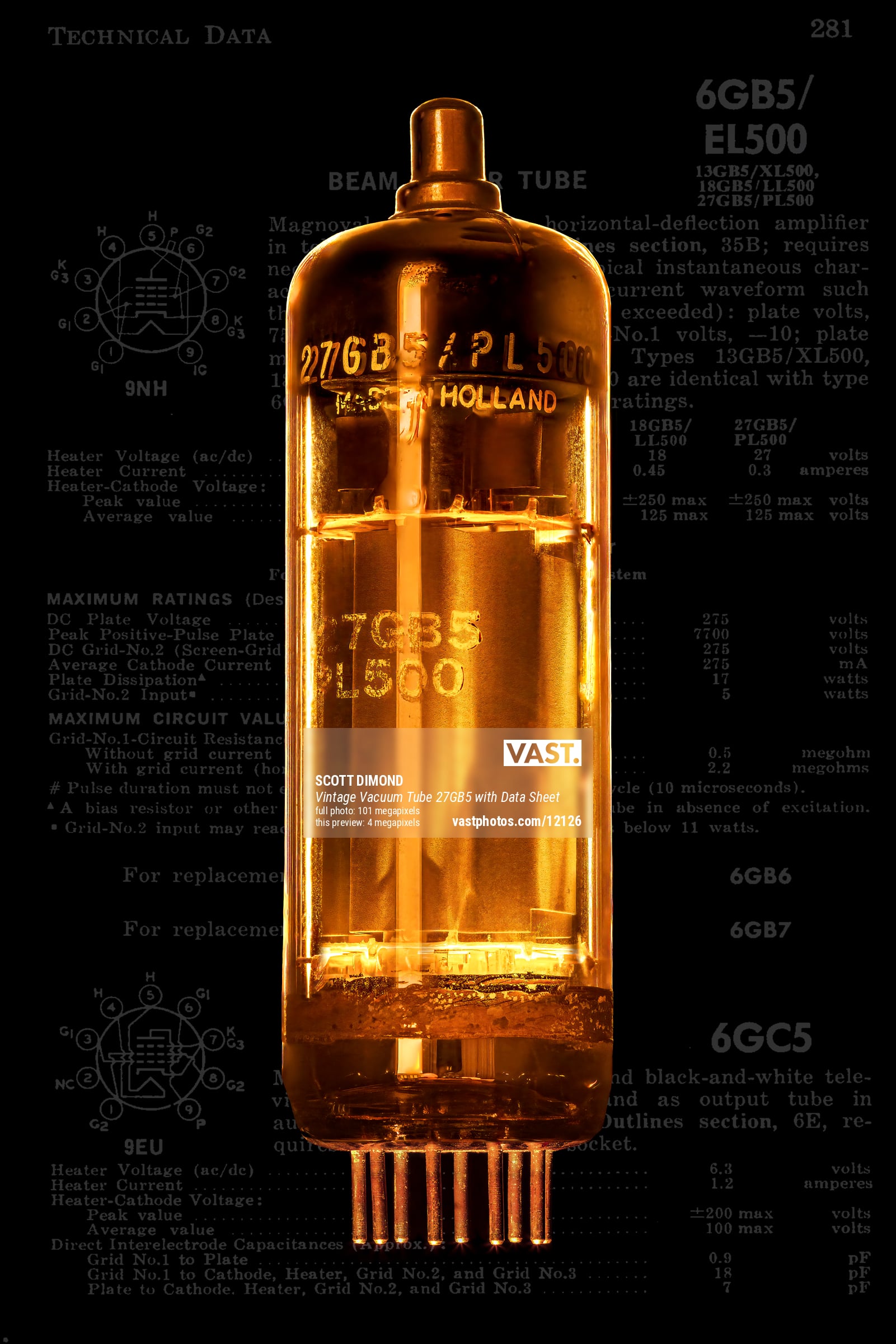 A close-up of "Vintage Vacuum Tube 27GB5 with Data Sheet" by Scott Dimond: an ultra-high-resolution VAST photo.