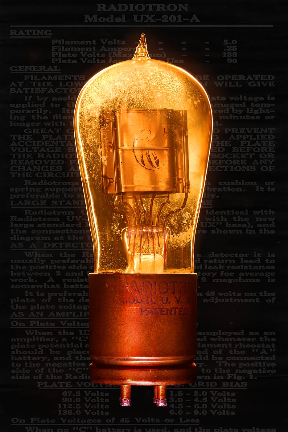 A close-up of "Vintage Vacuum Tube UX201A with Data Sheet" by Scott Dimond: an ultra-high-resolution VAST photo.