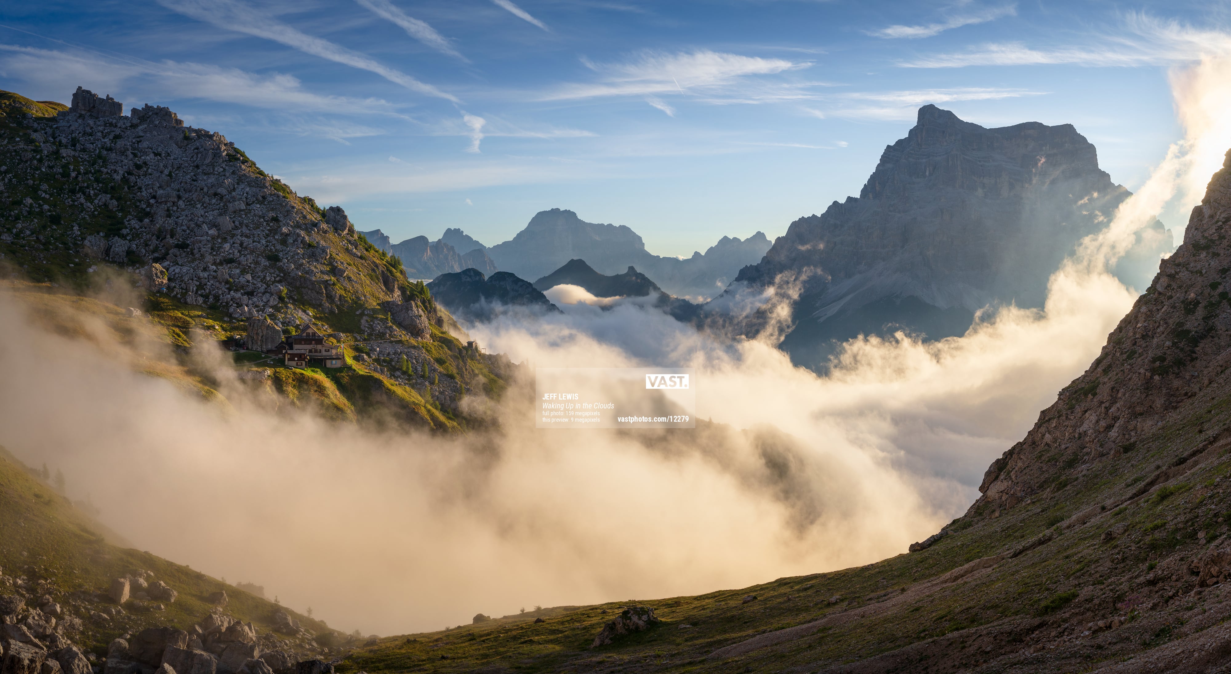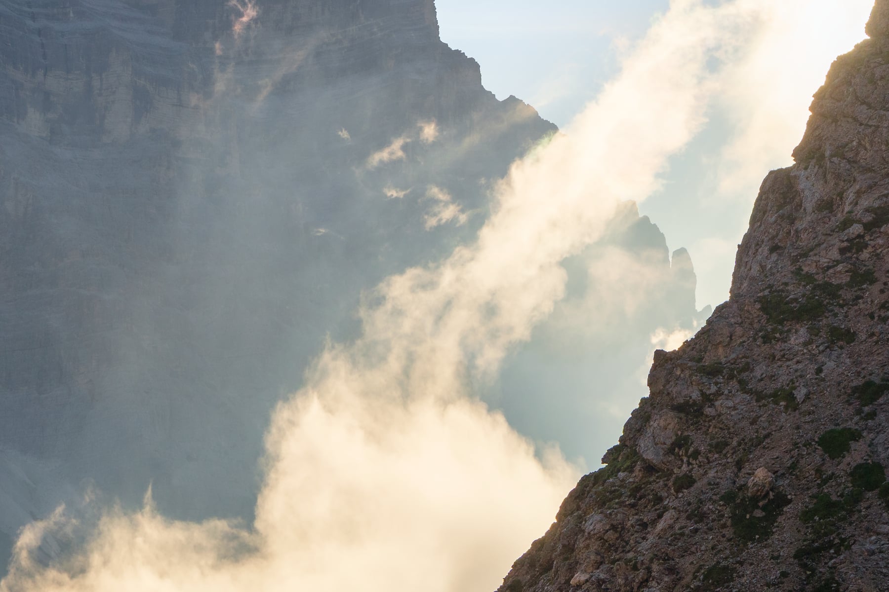 As a lush mountain region, the weather was everchanging and fickle -- there were times when we couldn't see any mountains for days at a time. But all storms break eventually, as long as you're patient! This is one of the photos I was able to capture on a lovely foggy morning, from one of my favorite rifigios that we were able to spend the night in. The fog was changing every moment, and the sunrise light brought everything together!
