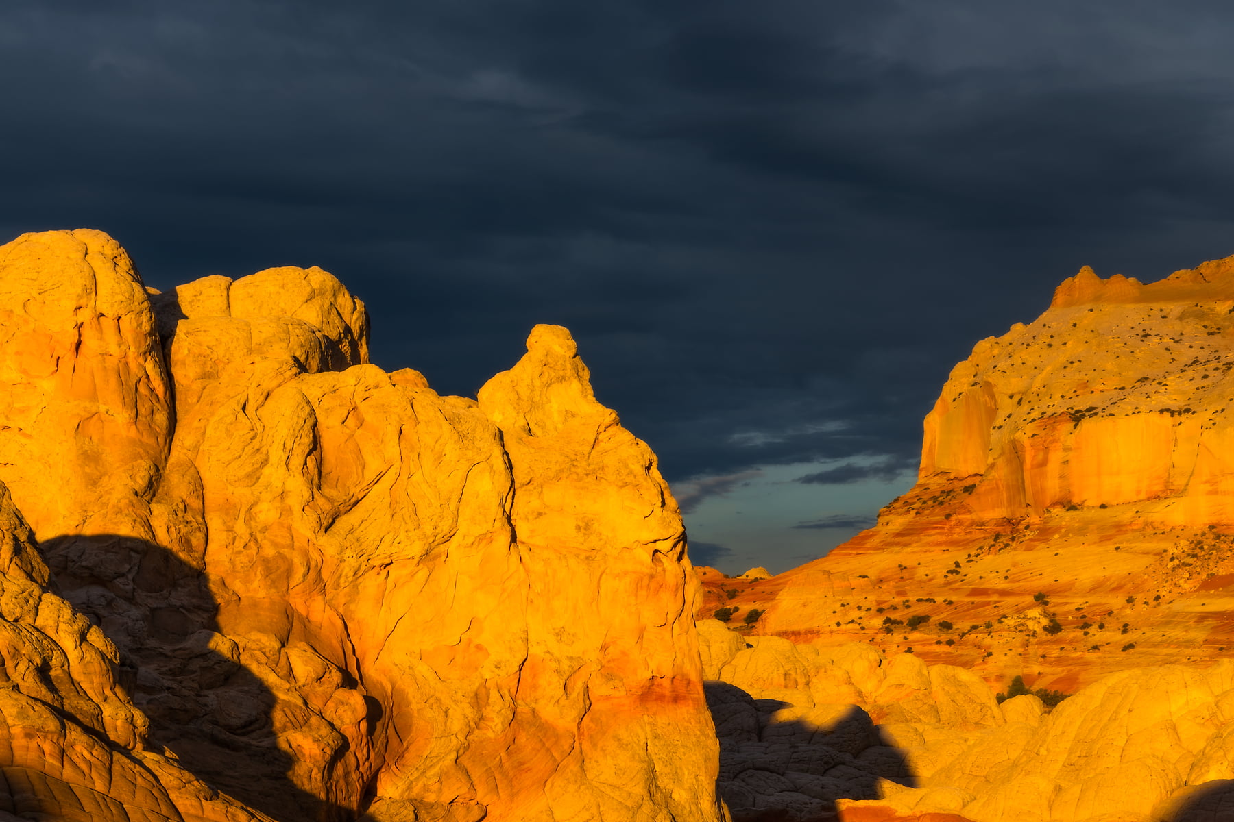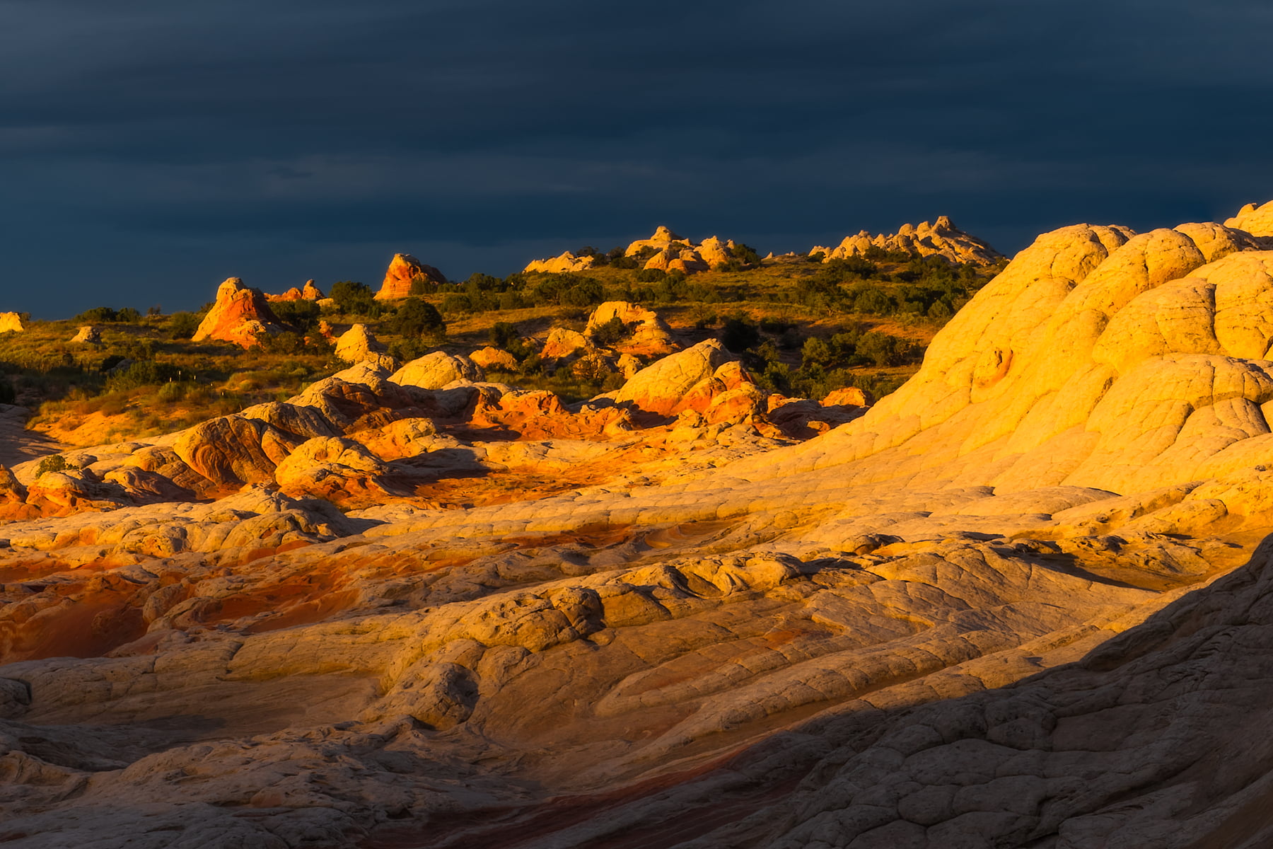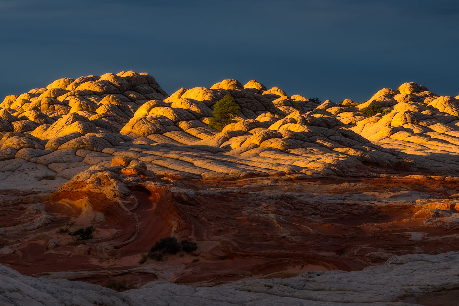White Pocket, Arizona. A place so remote it takes hours of expert driving through deep sand to reach it. An inhospitable place, few trees, almost no shade, no potable water, and yet so stunningly beautiful! The sandstone here is contorted into amazing shapes, peaks, valleys; red, orange, and white. All against a crystalline blue sky. The mystical shapes are the result of soft sediment deformation millions of years ago; now revealed by erosion. Here golden sunrise light illuminates the rock while storm clouds above threaten to drench the desert in much needed rain.