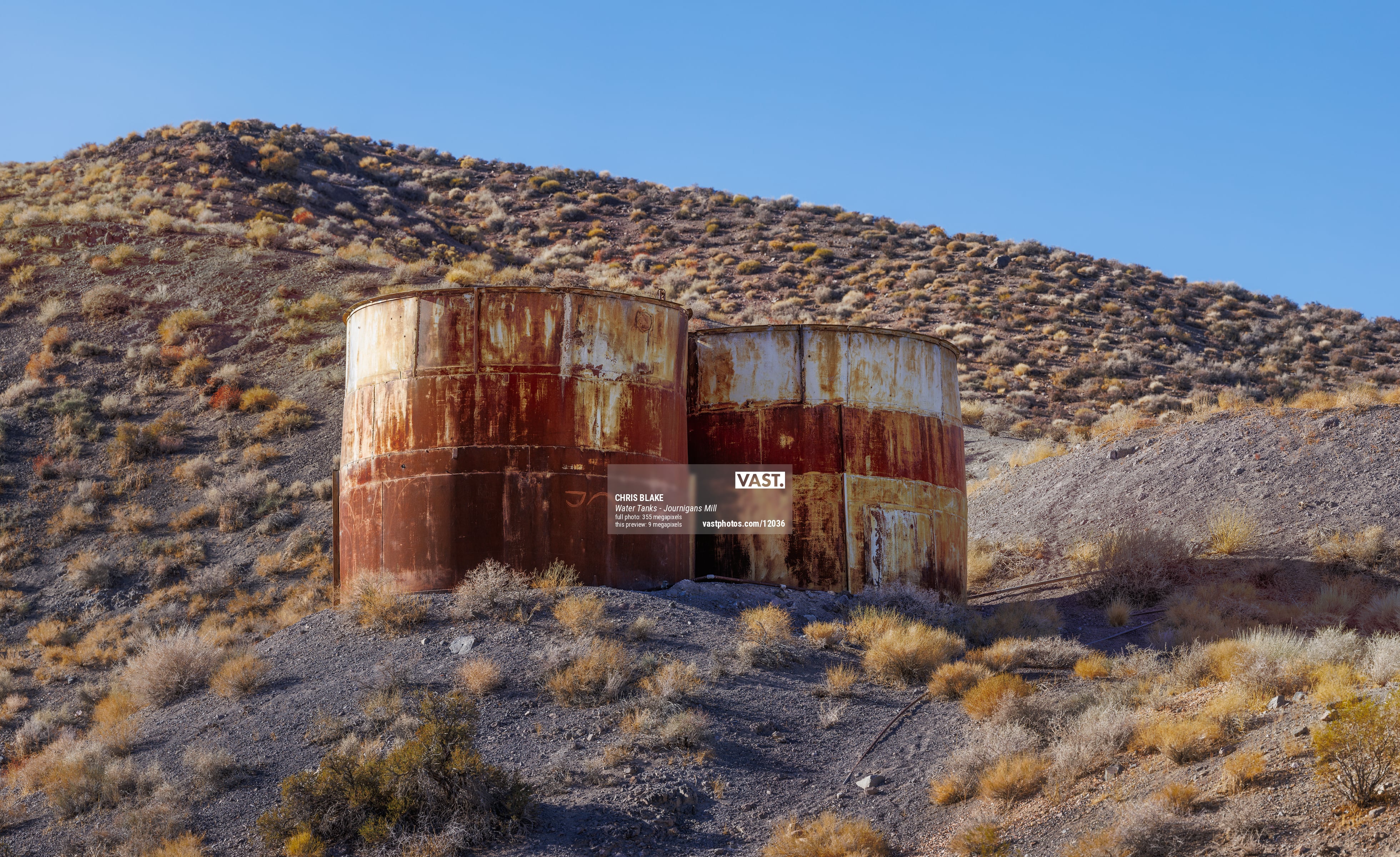 Perched on a rugged hillside in the Grapevine Mountains high desert of Death Valley, these massive water tanks stand as relics of a bygone era. Once an integral part of Journigans Mill, one of the many mining operations that dotted this remote landscape, the tanks now serve as silent sentinels of the past, weathered by decades of harsh desert conditions.