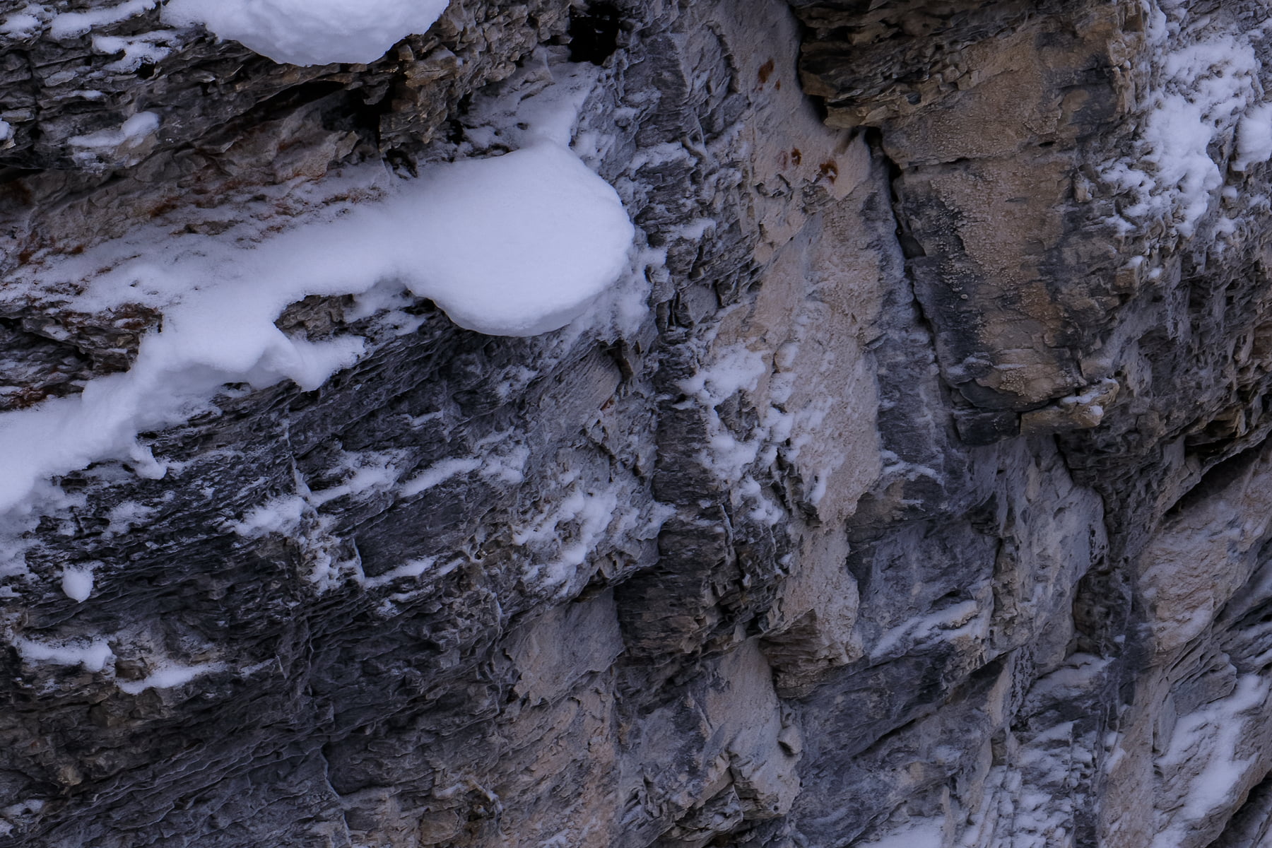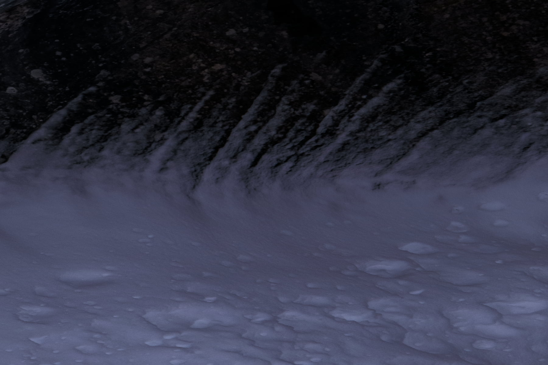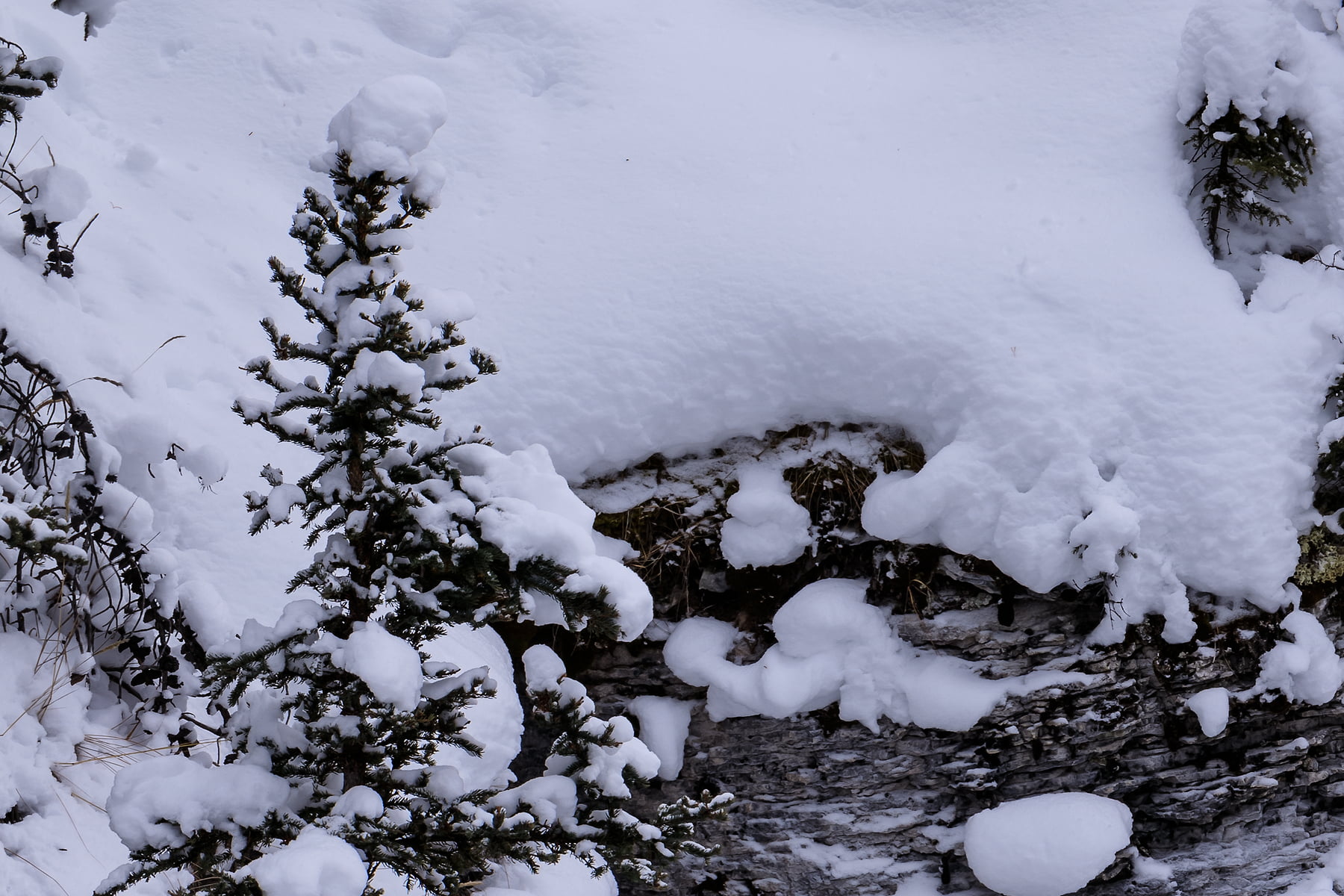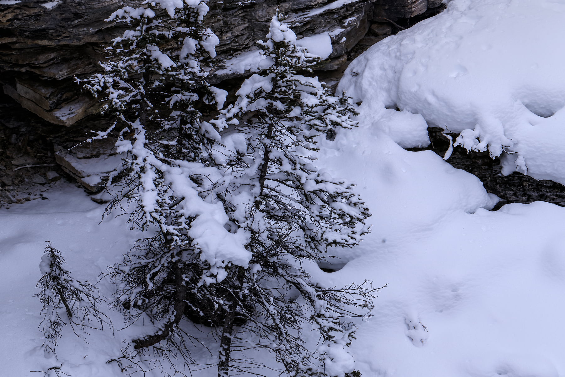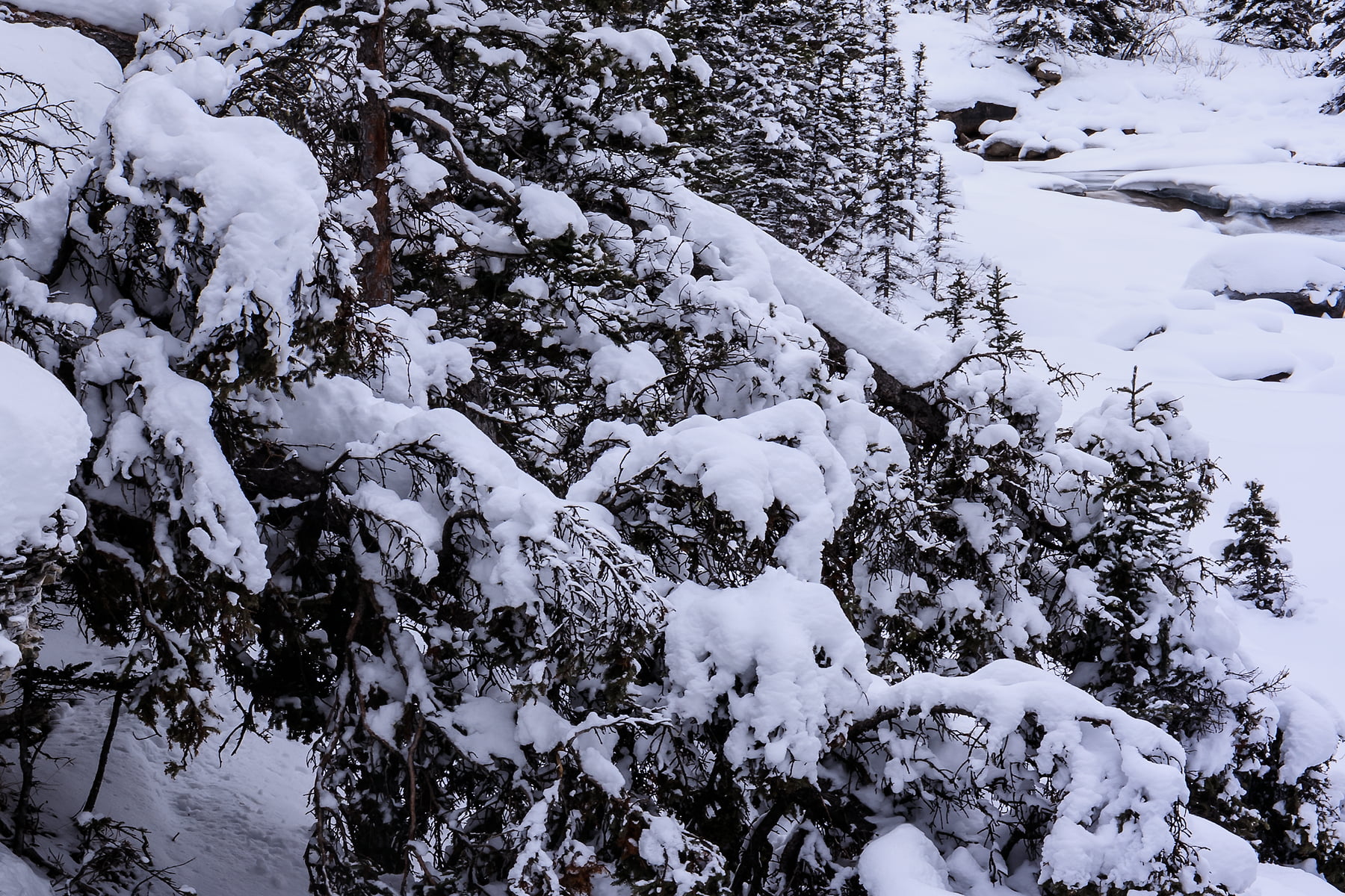 After photographing Castle Mountain, I headed up the just re-opened Icefields Parkway. The amount of new snow was incredible. In some places, the snow plows had only been able to cut a single lane through the huge drifts. After a long drive and frequent stops to photograph some other snow-covered areas along the way, I arrived at Mistaya Canyon, a beautiful and accessible canyon that is known for its distinctive curvy canyon walls. When I arrival, I was super excited to see that I would be the first visitor to the canyon since the huge snowfall/road closure, as the trailhead was untouched and under a meter (3 feet) of fresh snow.