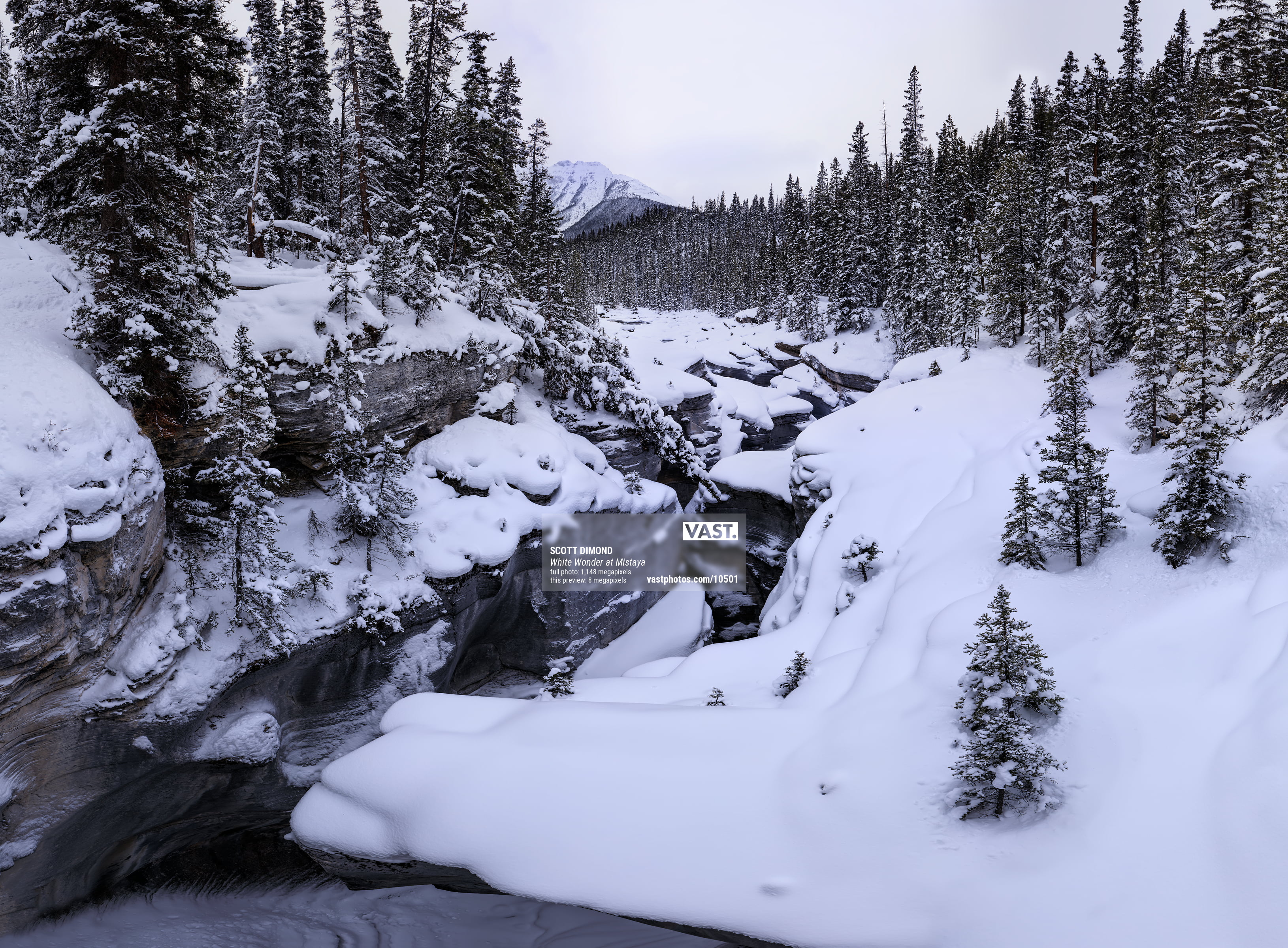 With my camera gear and my special VAST equipment on my back, I donned my snowshoes and made my way downhill the bridge that crosses the Mistaya River and the canyon below. Once there, I setup my VAST equipment on the bridge and as it started to snow again, I worked quickly to capture over 600 images in just under 40 minutes. All those images would be necessary to assemble this high-resolution image with incredible depth of focus. Once the photo taking was over, I sat and enjoyed the view in complete solitude for quite some time. It was quiet and peaceful. There is just something I love about white fresh untouched snow in the mountains.
