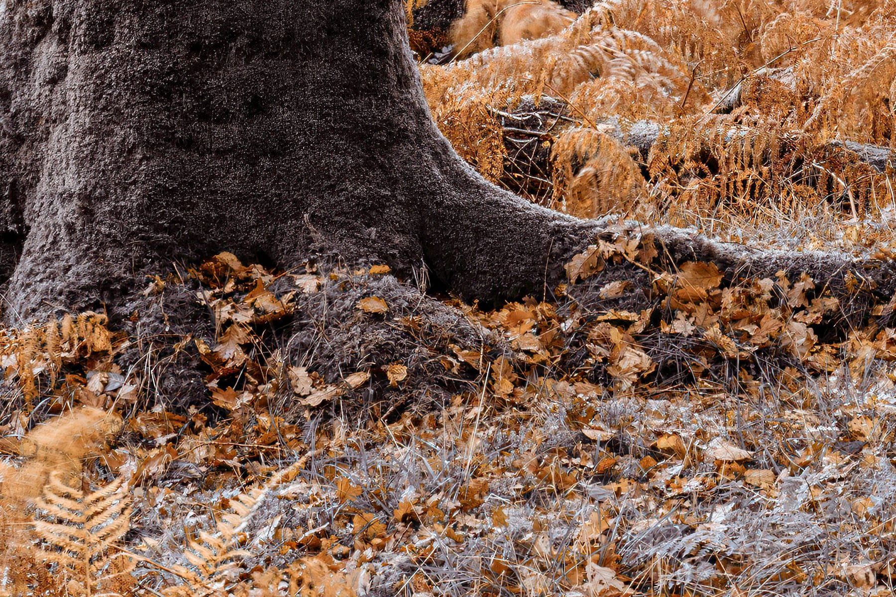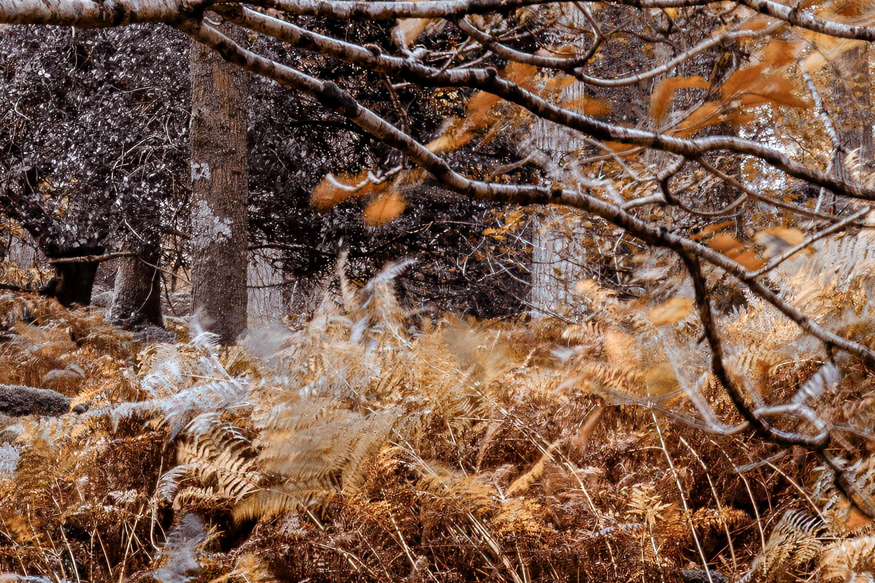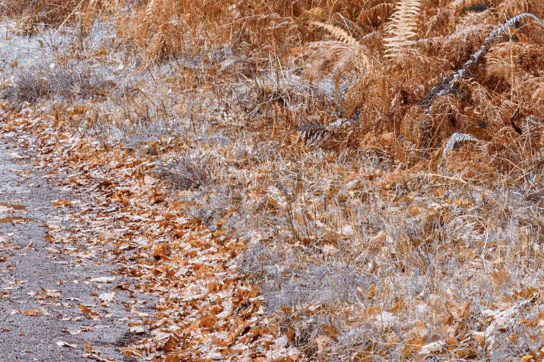 This picturesque scene captures a serene winding path through the enchanting forests of the Lake District, UK. The soft curves of the road lead the viewer’s eyes through the heart of the forest, inviting a peaceful stroll amidst the towering trees. The autumn tones dominate the image, as the warm golden hues of fallen leaves cover the ground, contrasting beautifully against the tall trunks and subtle, muted foliage. The quietness of the forest adds to the sense of calm and reflection, allowing one to escape into nature’s beauty.