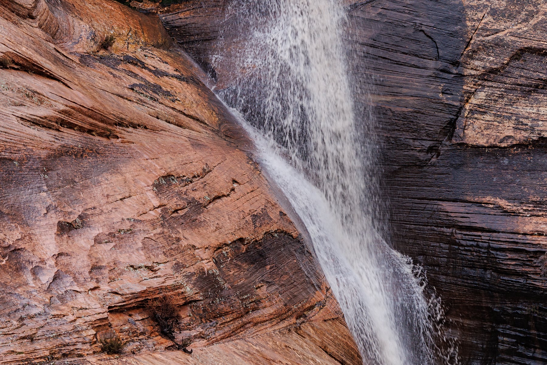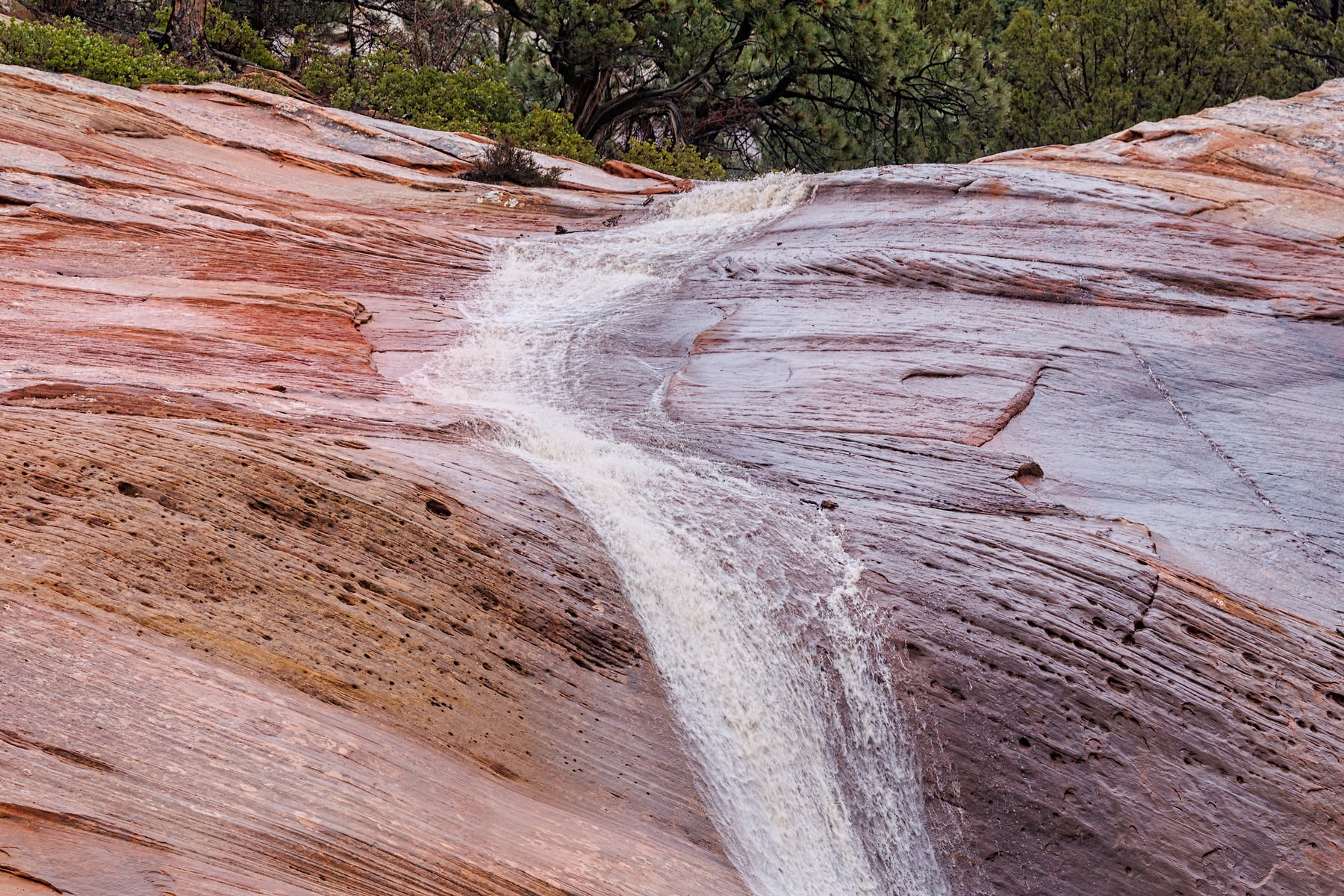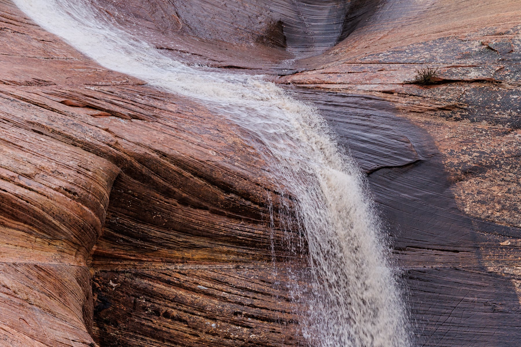 This image captures a fleeting moment on the east side of Zion National Park during a cold winters day, where rain and melting snow from higher elevations gave life to impromptu waterfalls, like the one featured here. The soft yet rugged textures of the slickrock canvas, painted in earthy reds and browns, guide the eye downward along the path carved by the rushing water. Trees and vegetation cling to the rock, adding contrast and life to the stark landscape. Taken in the park's backcountry, this scene highlights the power and beauty of nature's seasonal transformations.